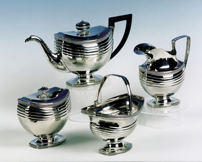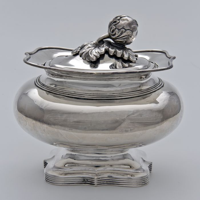 Vierdelig theeservies: zilveren suikerpot met hengsel