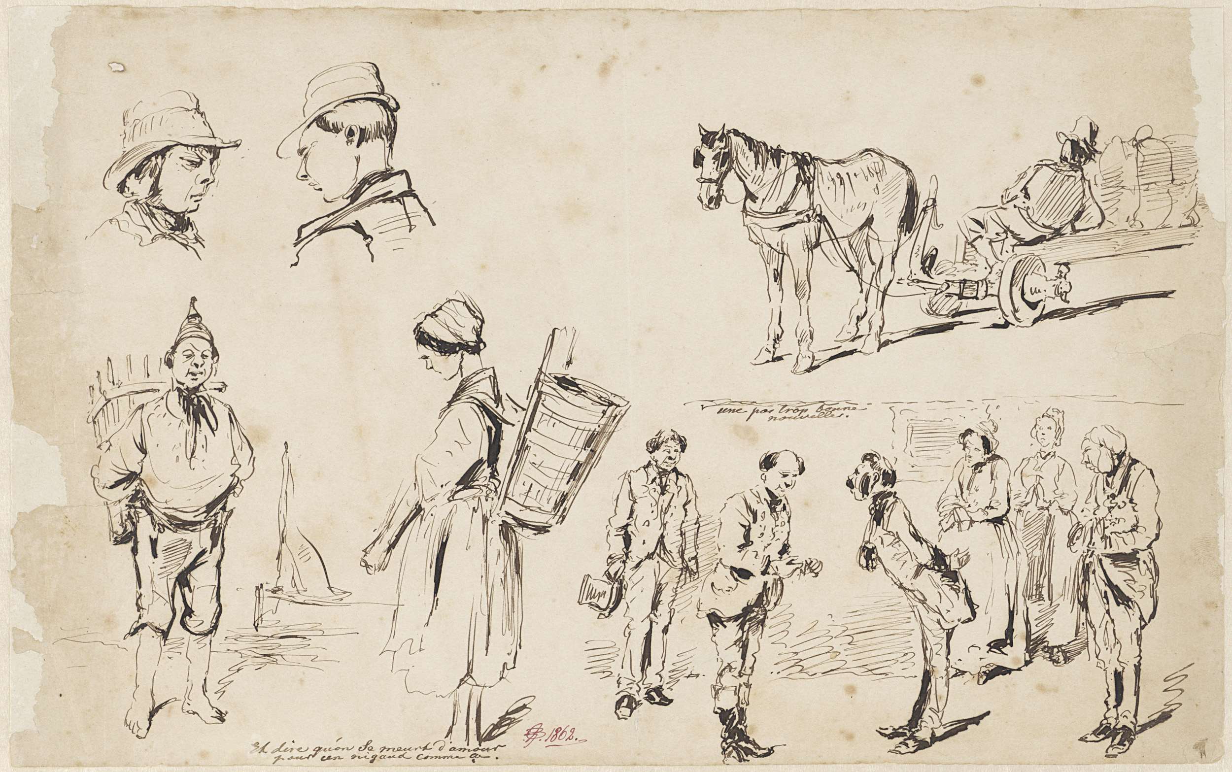 Karikatuur van twee om een vrijer kijvende marktwijven