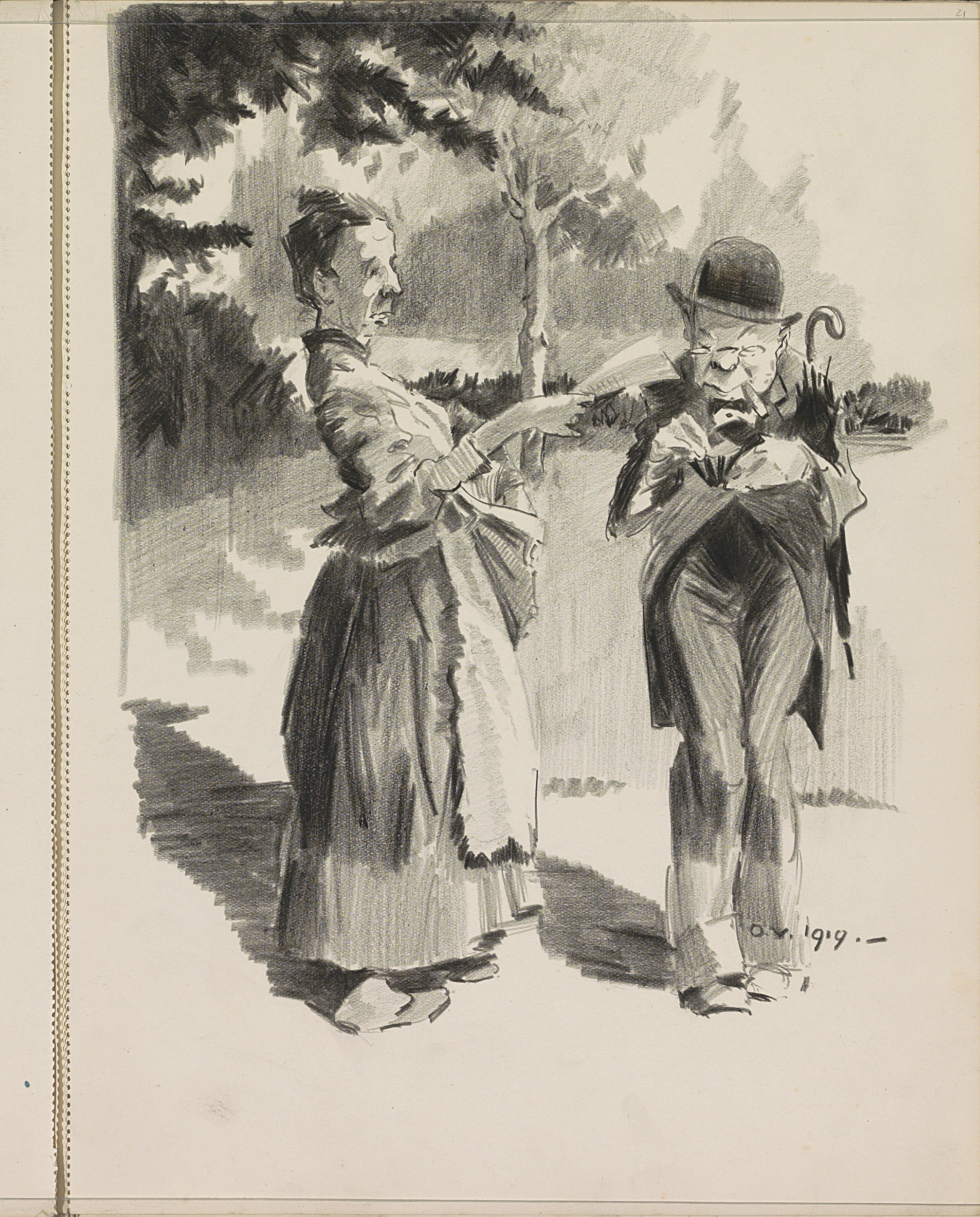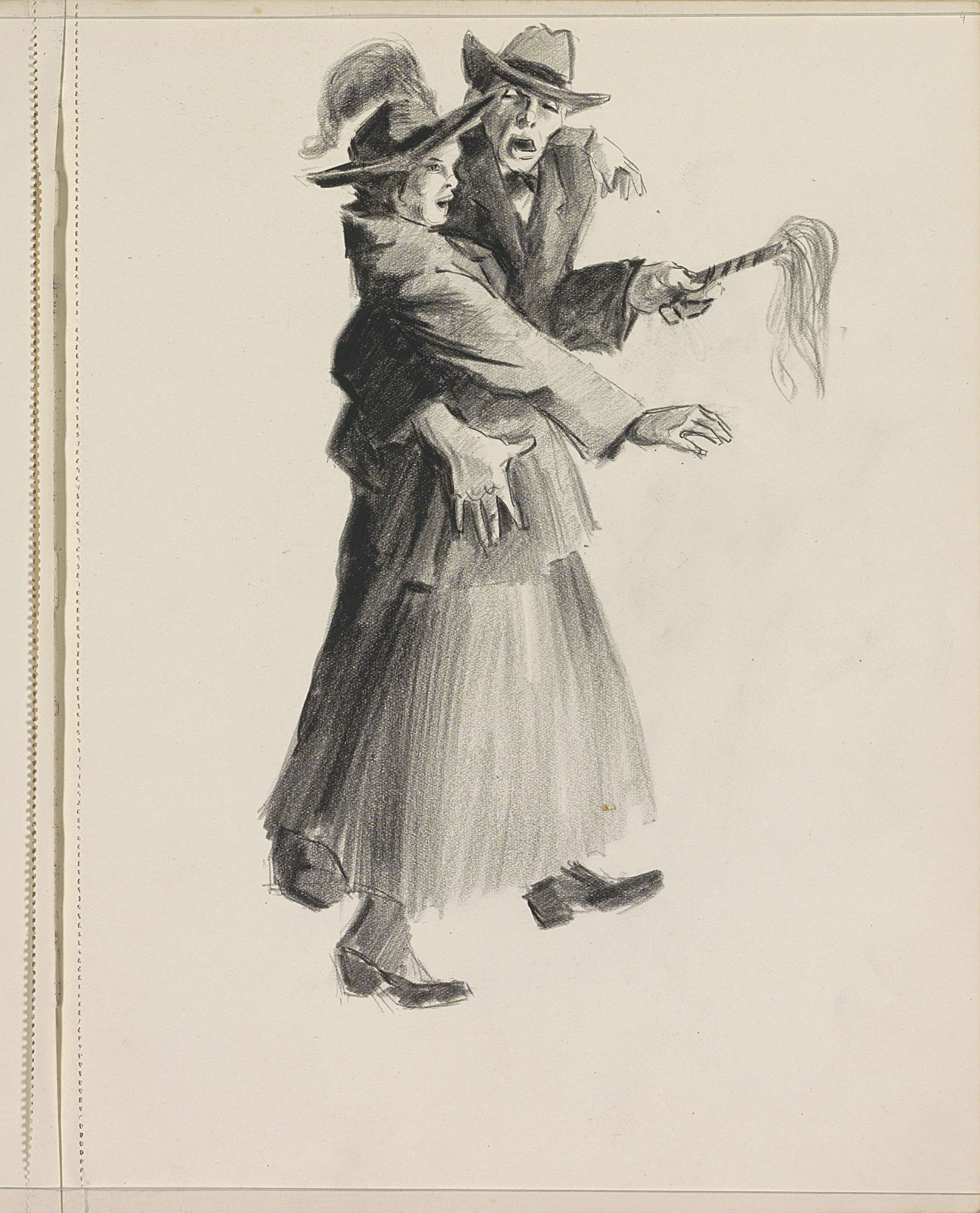 Man met staf en een vrouw die een schrikbeweging maakt