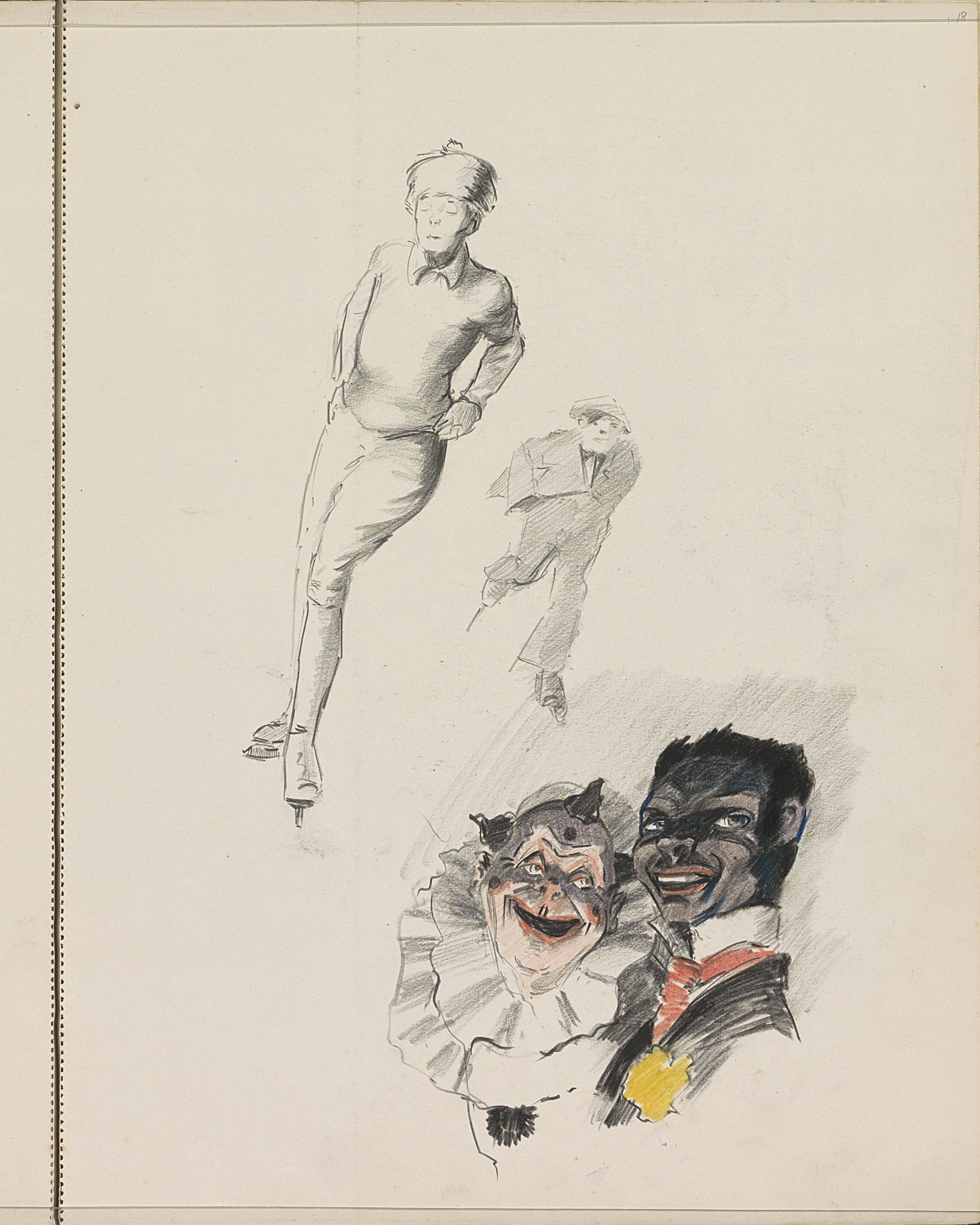 Schaatsende man en jongen en twee figuren uit een Co...