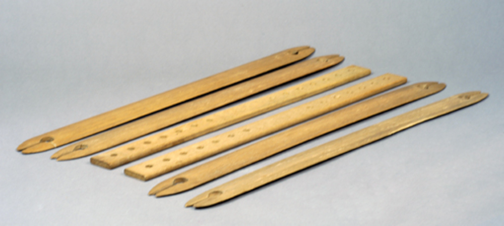 4 houten spoelen en 2 houten kruisroeden van een wee...