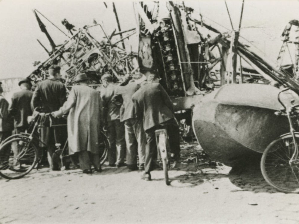 Foto mannen bij wrakstukken vliegtuig. Tekst achtero...