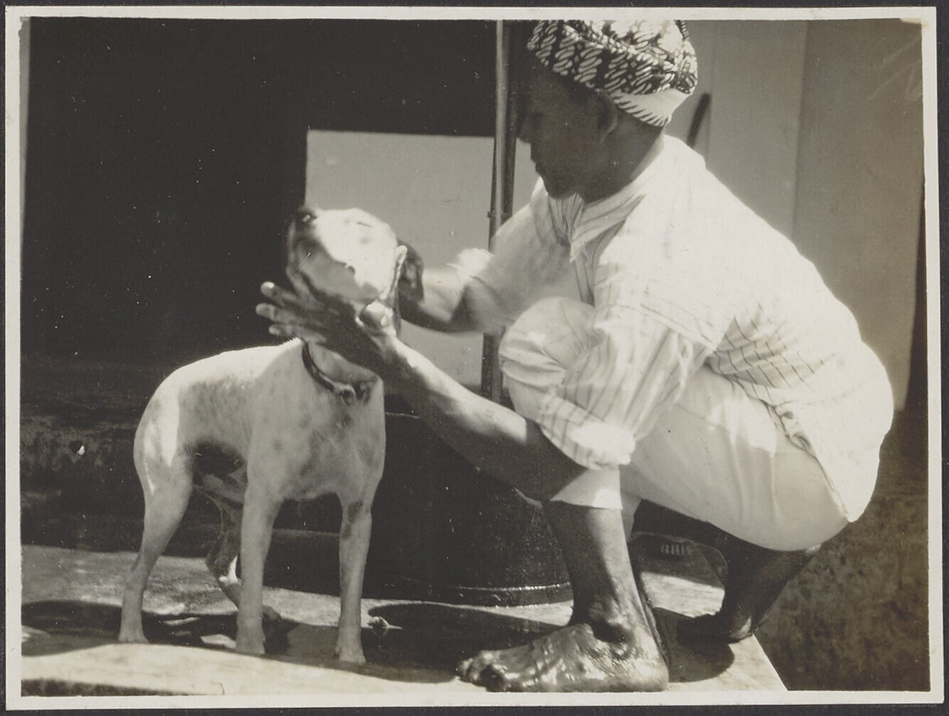 Een Javaans lid van het huispersoneel wast de hond i...