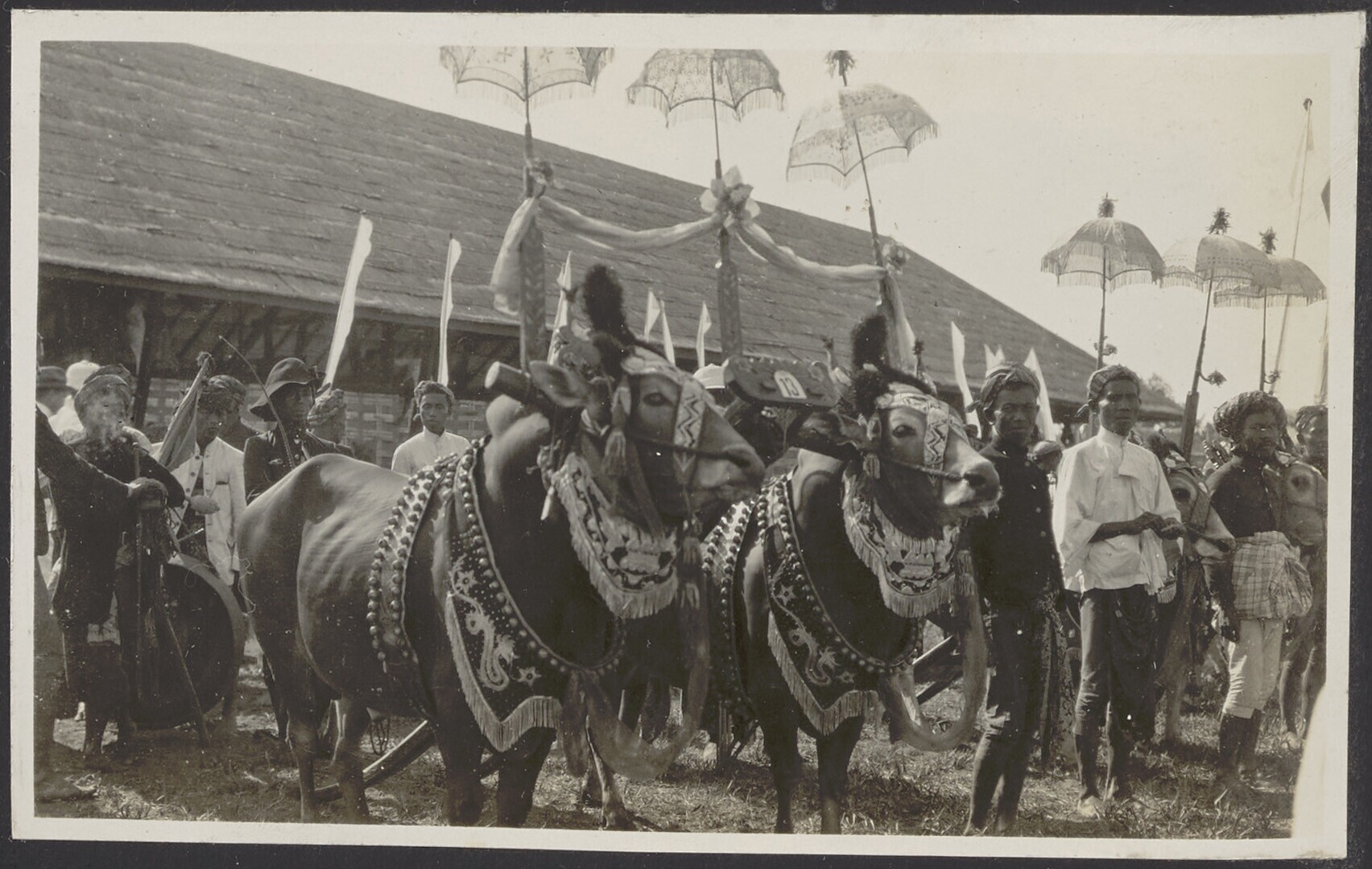 Mooi versierde ossen met ploegen staan klaar