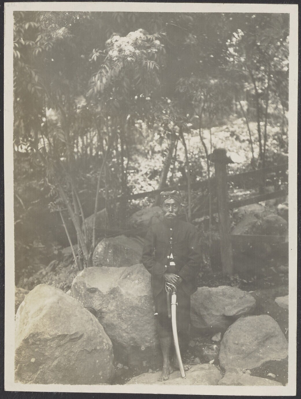 Javaanse oude man met sabel staat tussen de rotsen i...