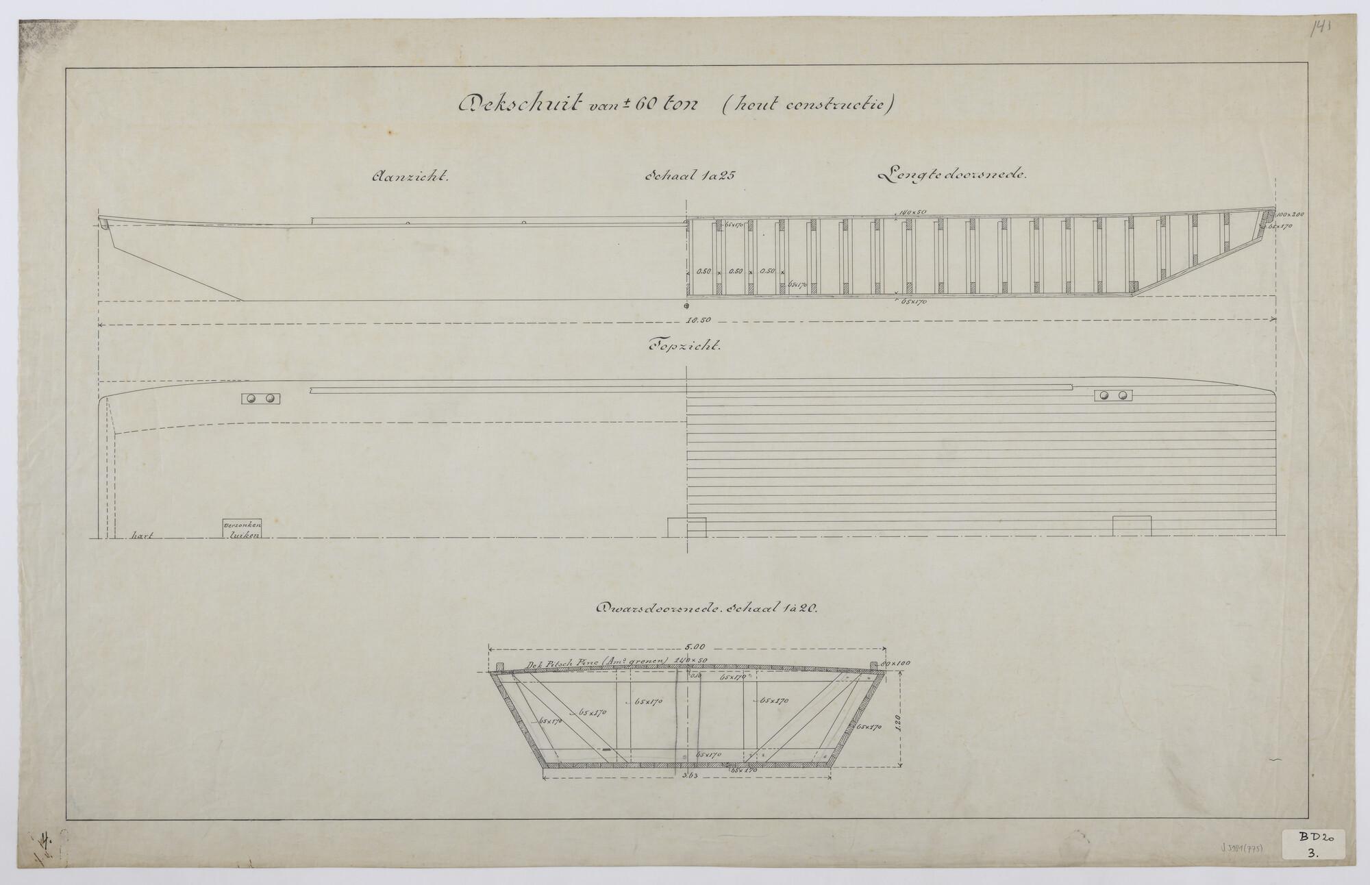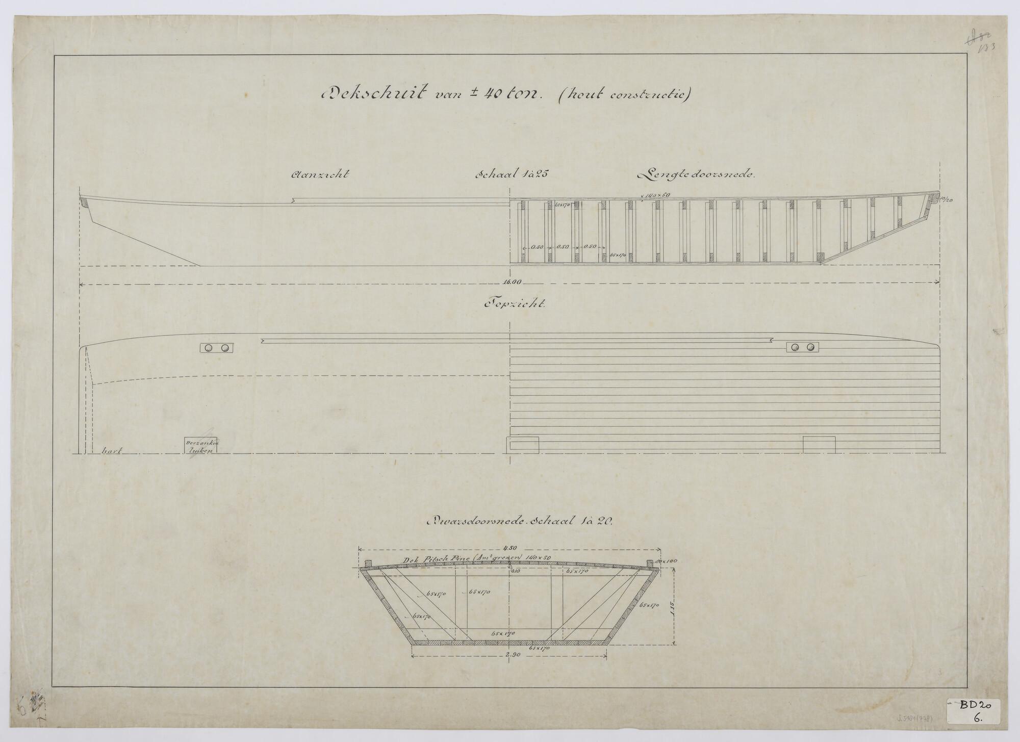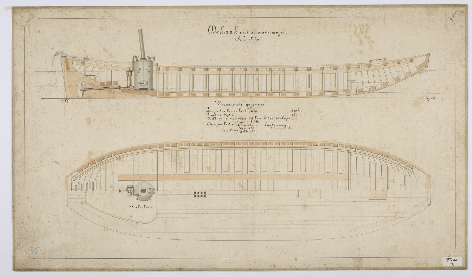 Algemeen plan van een stalen dekschuit met dekhuis i...