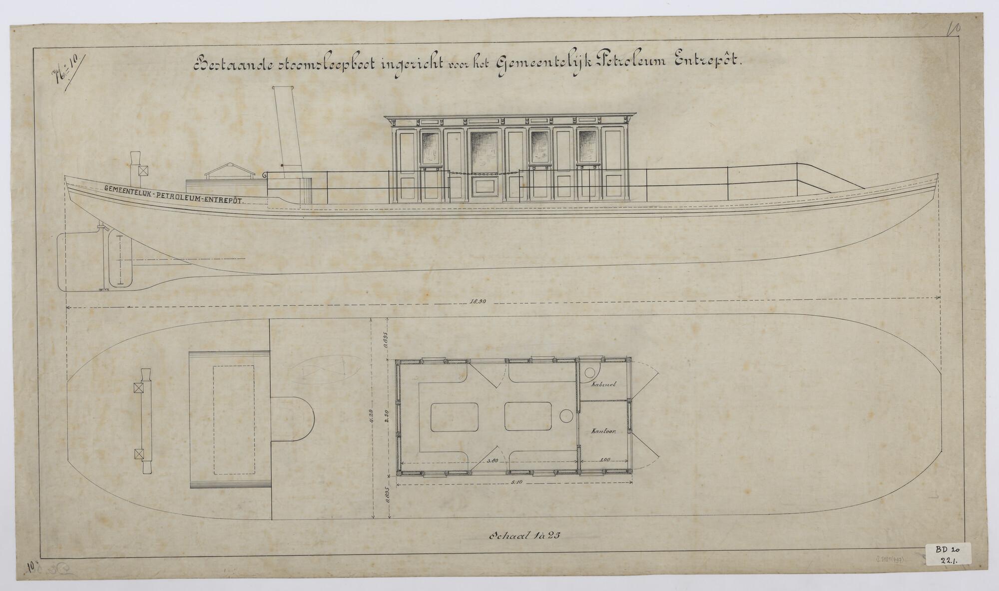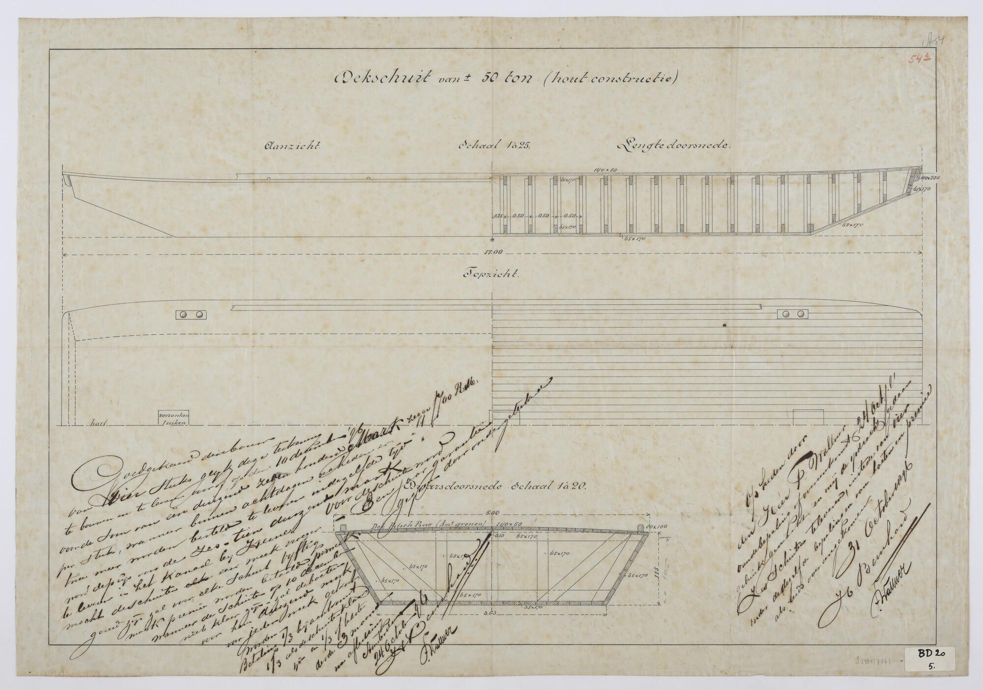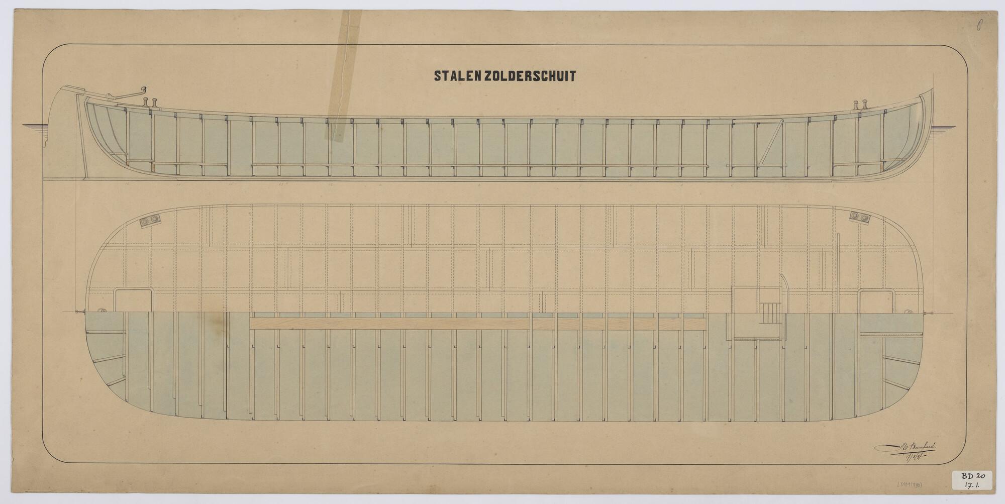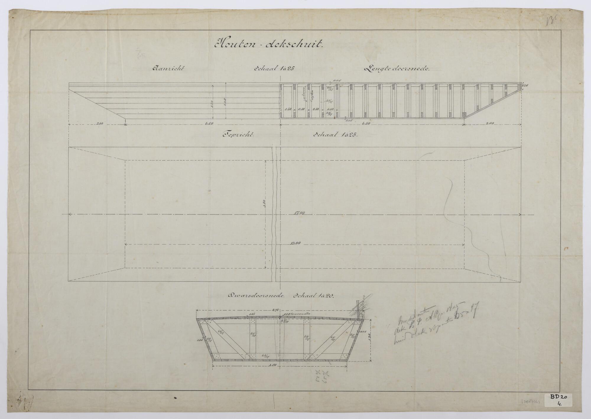 Algemeen plan van een stalen dekschuit met dekhuis i...