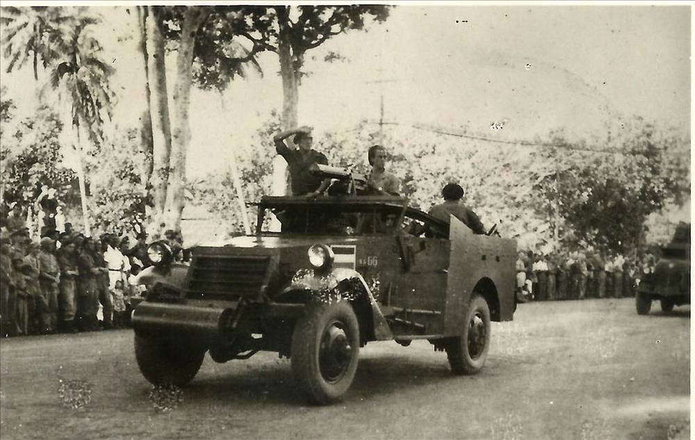 Ned. Indië na WO 2; parade, militair voertuig, isnpe...