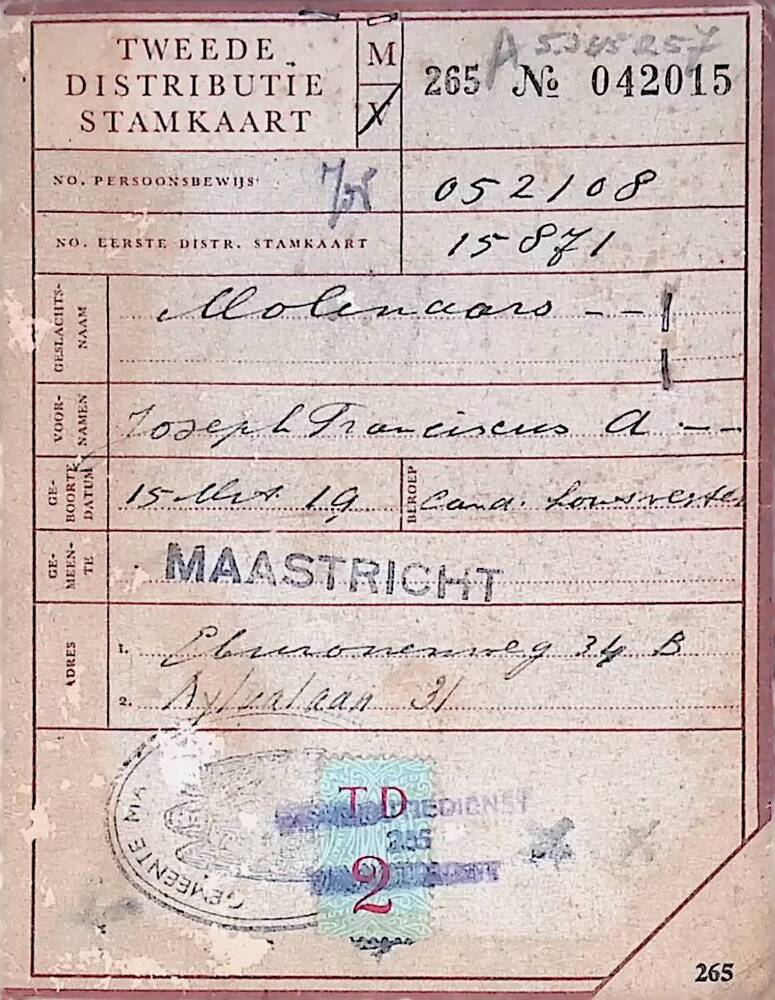 Tweede Distributiestamkaart op naam van Molenaars, J...
