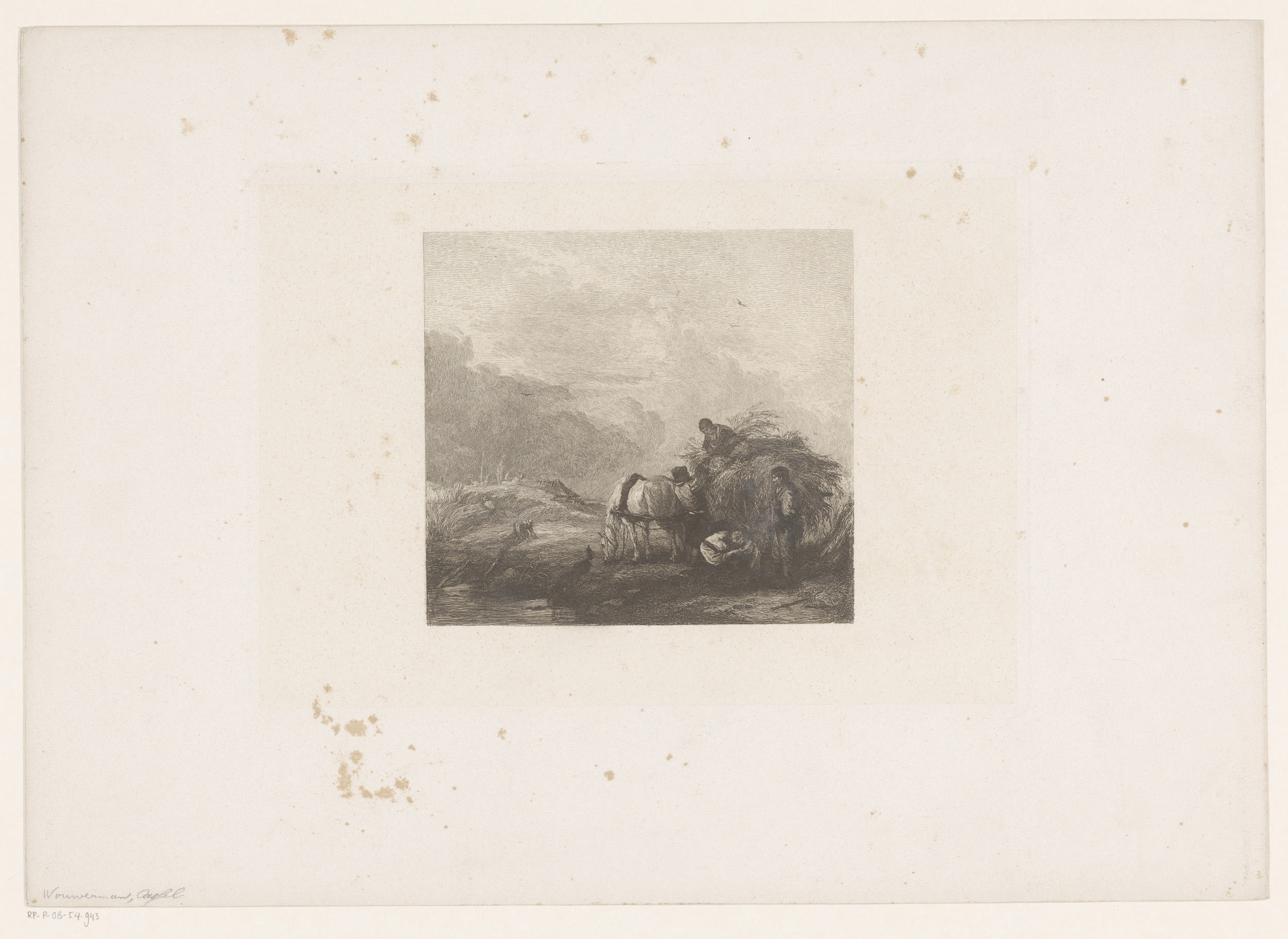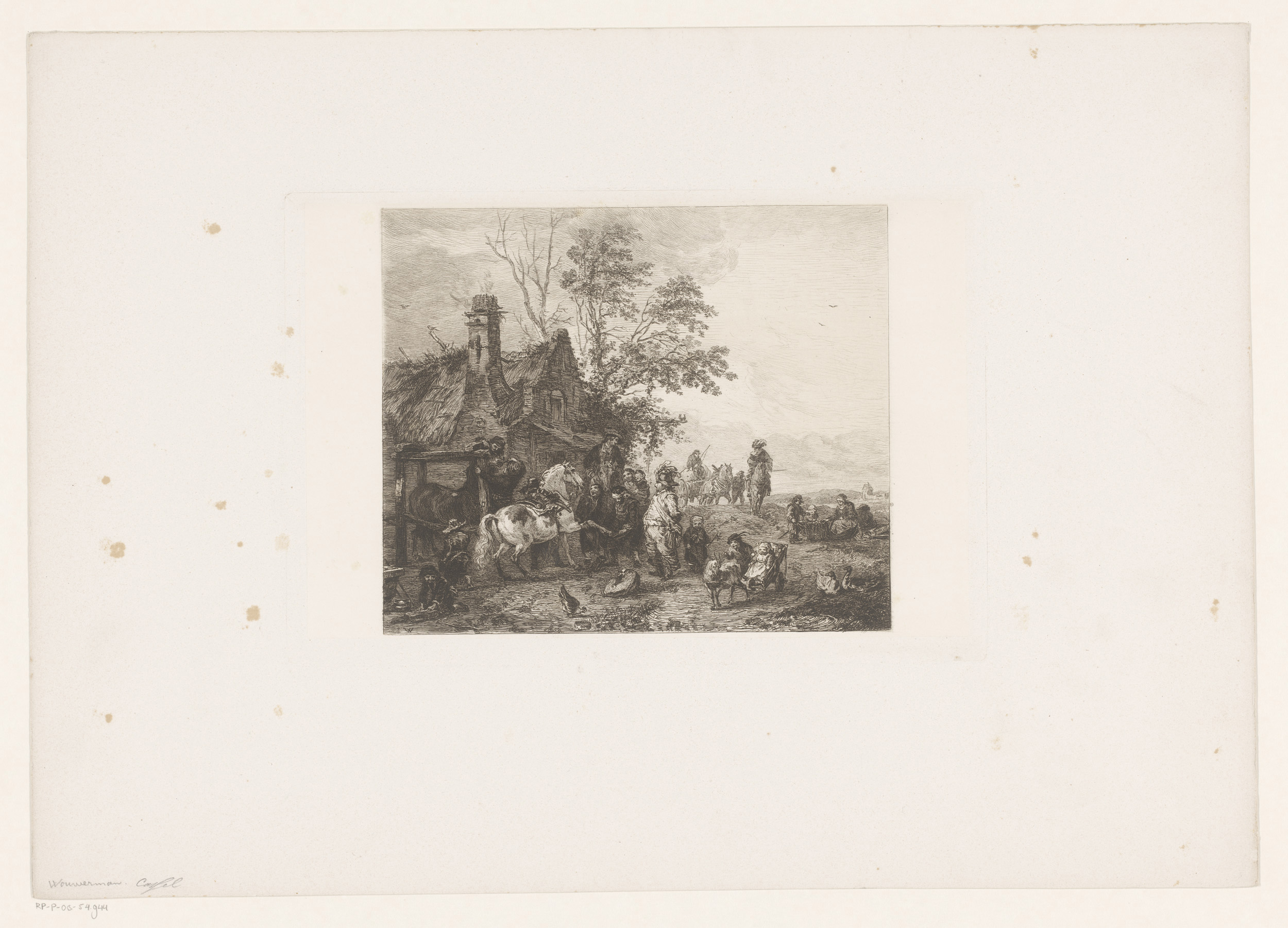 Gezelschap met paarden bij een smederij