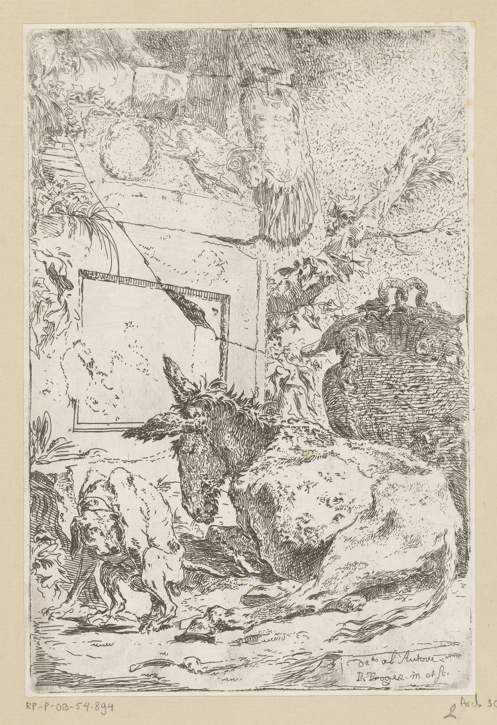 Ezel en hond bij een ruïneus monument