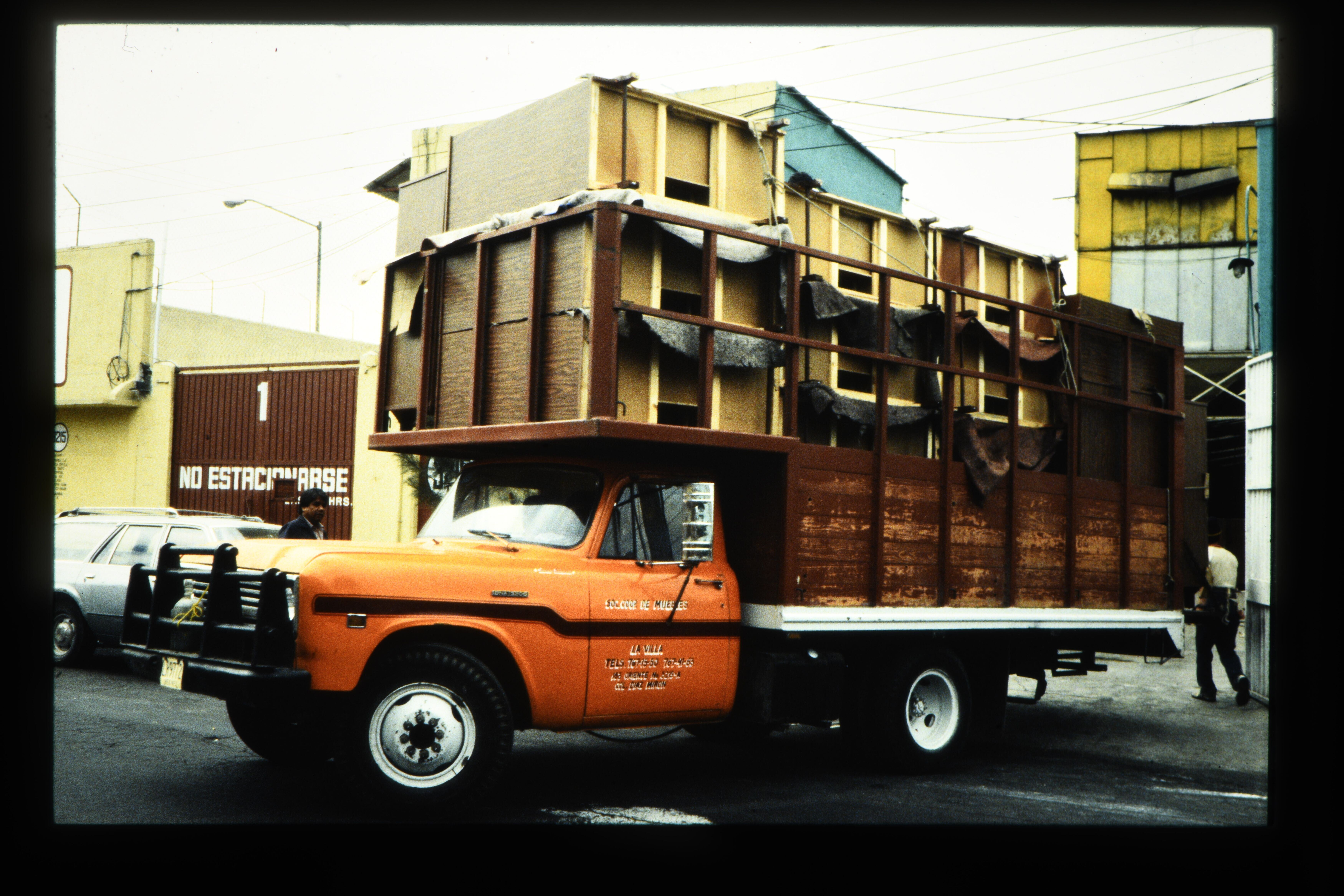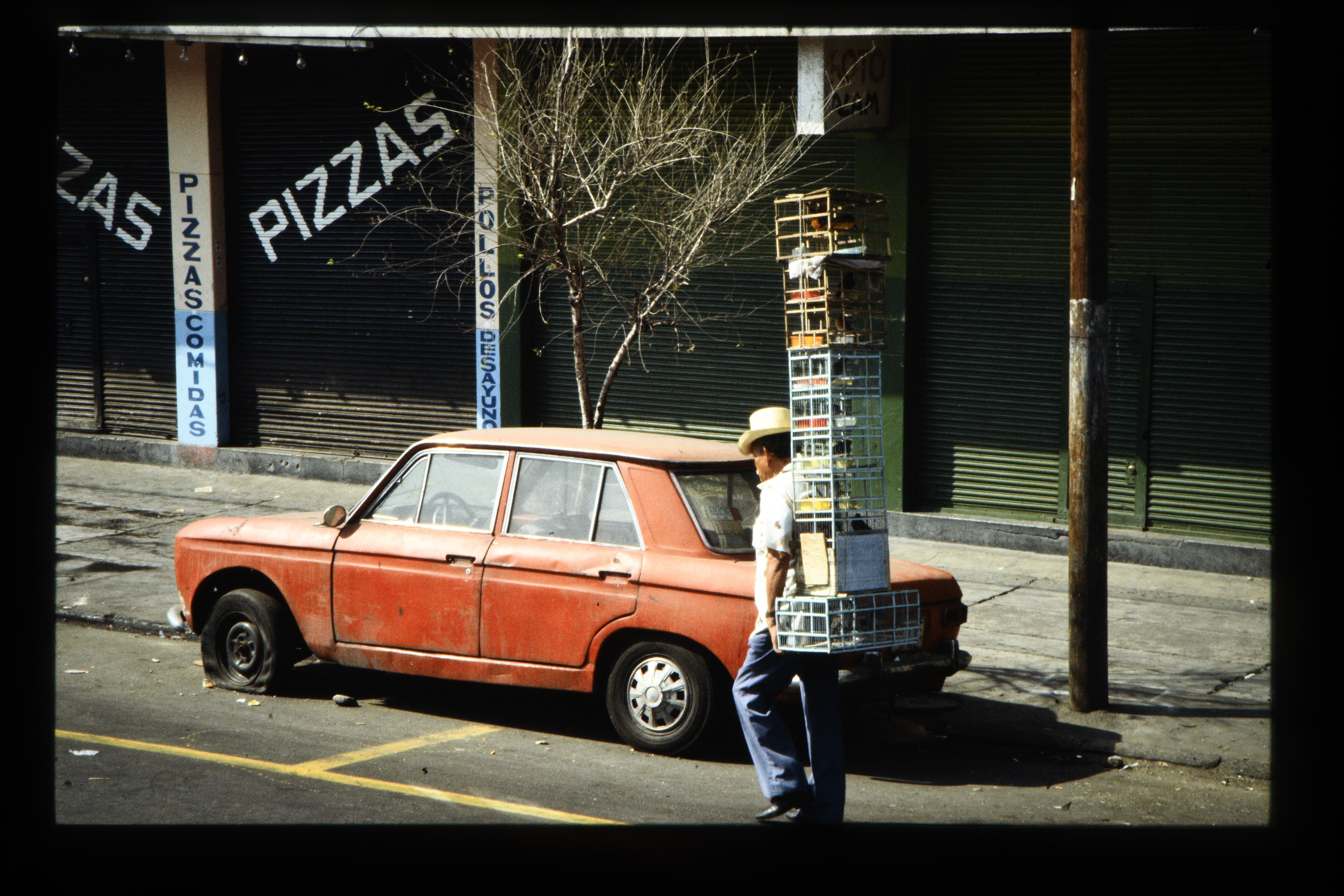 'Man sjouwt een berg kratten met vogeltjes. Tepito. ...
