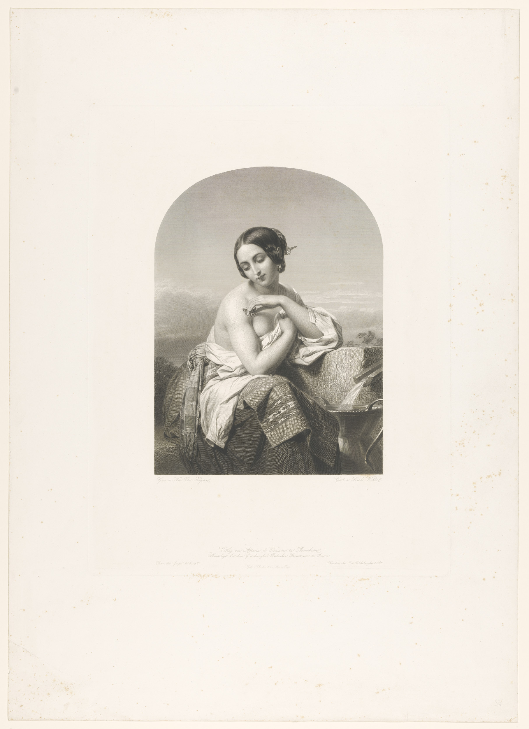 Zittende halfnaakte vrouw met een vlinder