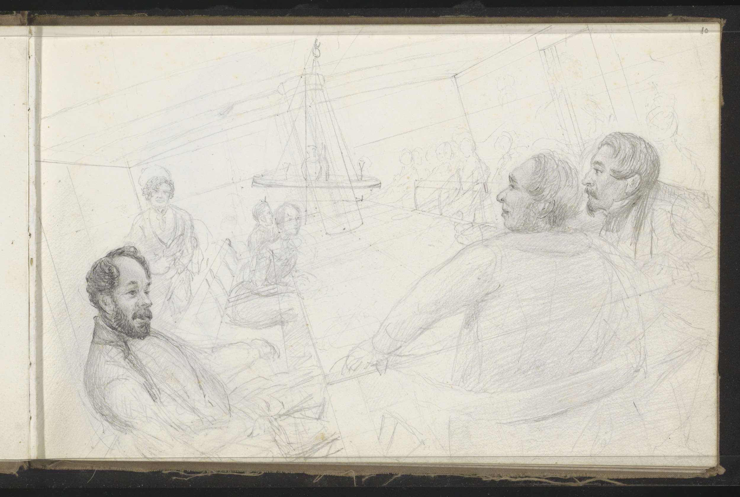 Figuren rond een tafel in een kajuit bij stormachtig...