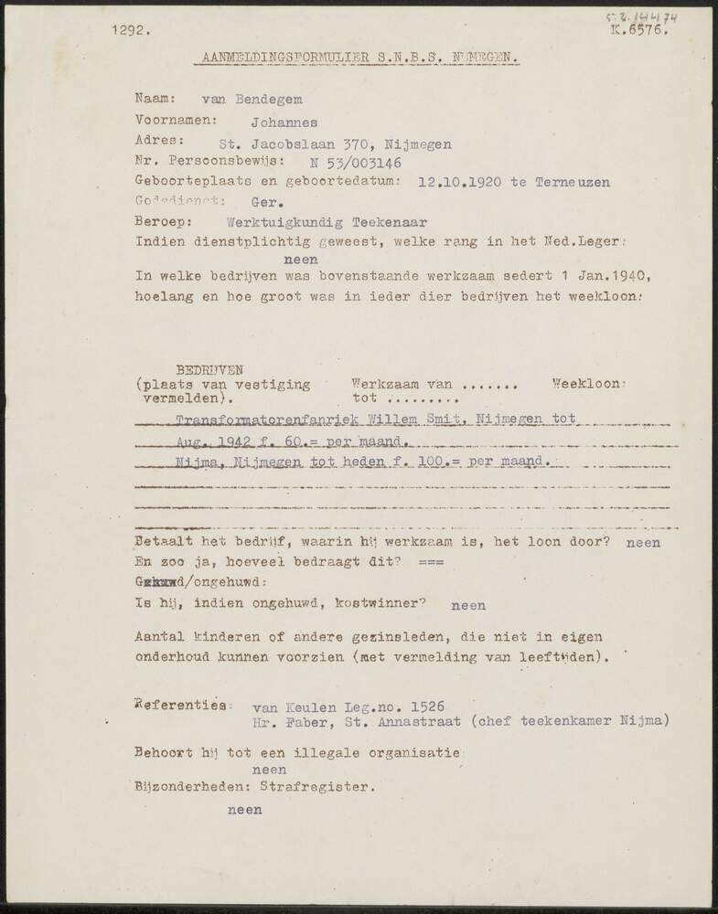 Aanmeldingsformulier S.N.B.S. Nijmegen op naam van J...