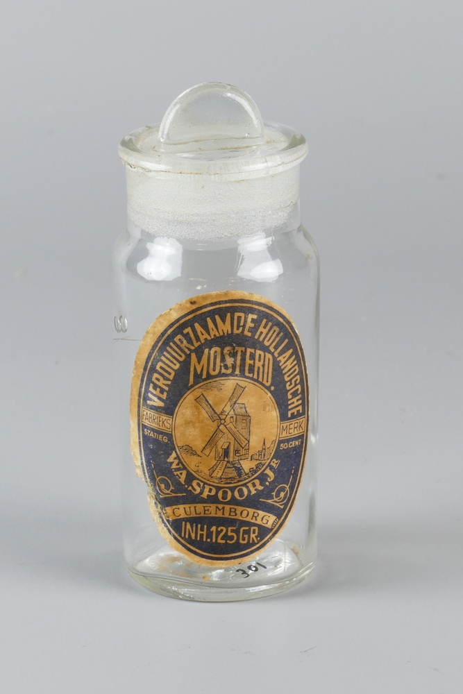 mosterdpot met geslepen stop van kleurloos glas geas...