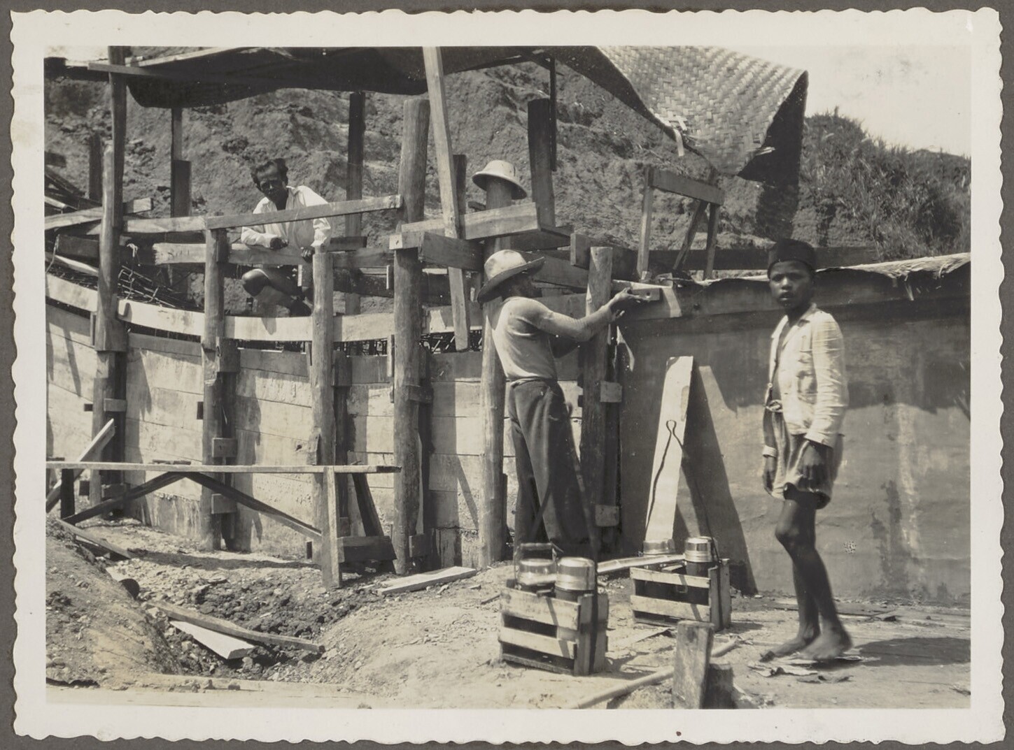 Javaanse mannen bij de bouw van een onderdeel van aq...