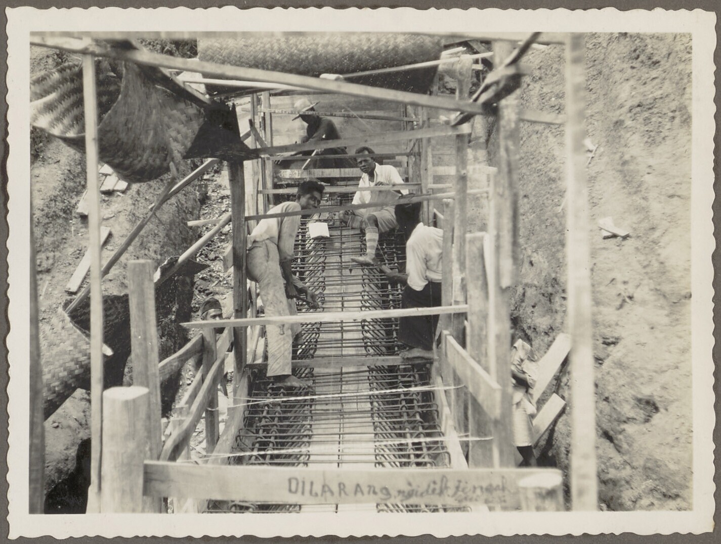 Javaanse arbeiders aan het werk met bewapeningsijzer...