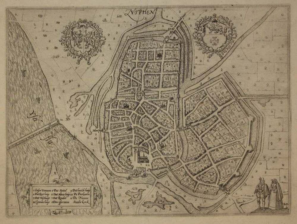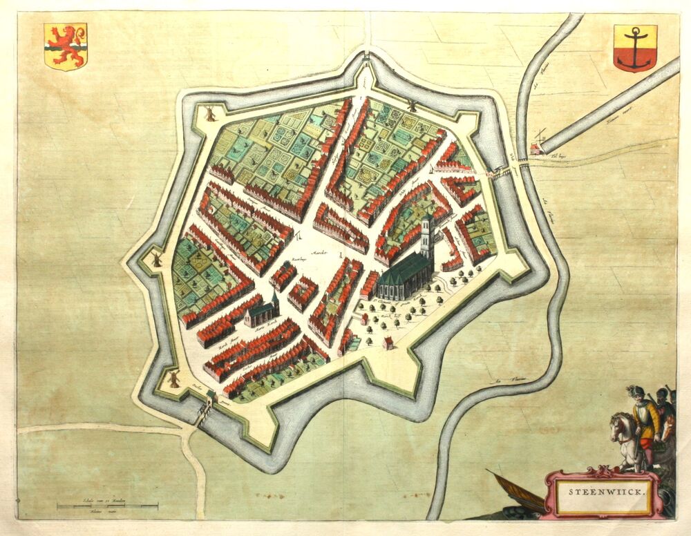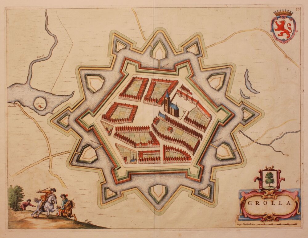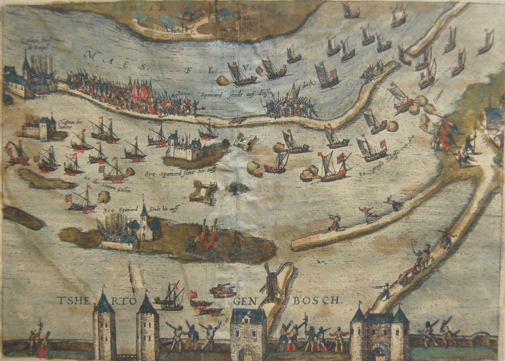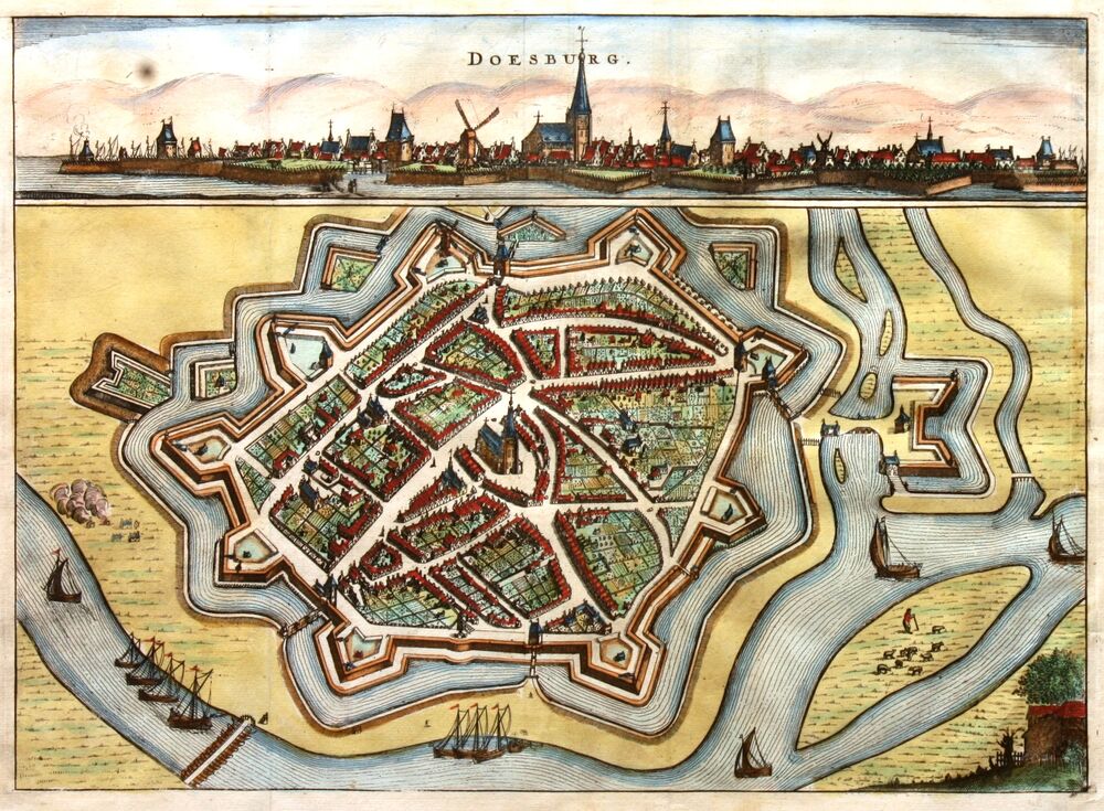 Vogelvlucht beleg Zaltbommel in 1599 met forten, sch...