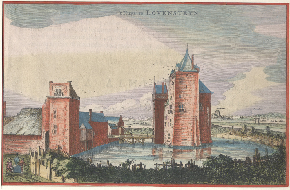 Gezicht op Loevestein met slotgracht, poort- en bijg...