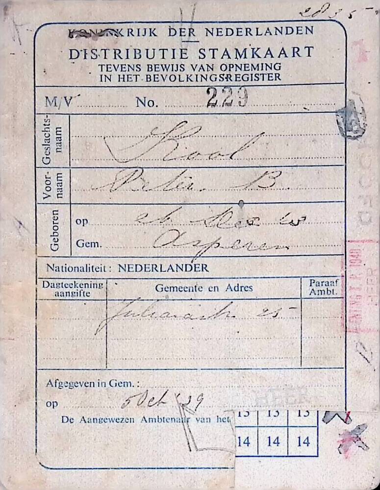 Distributiestamkaart op naam van P.B. Kool