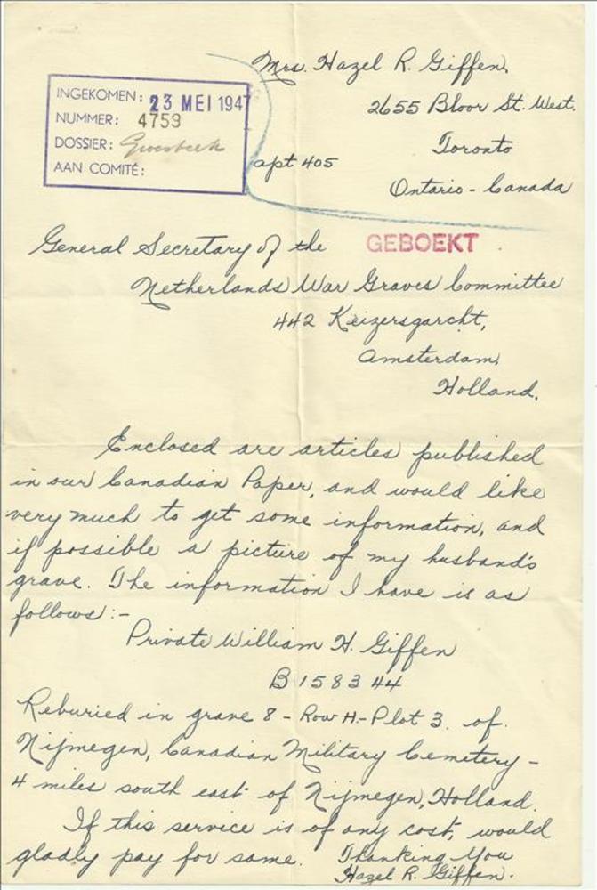 Brief van een Canadese weduwe over een oorlogsgraf t...