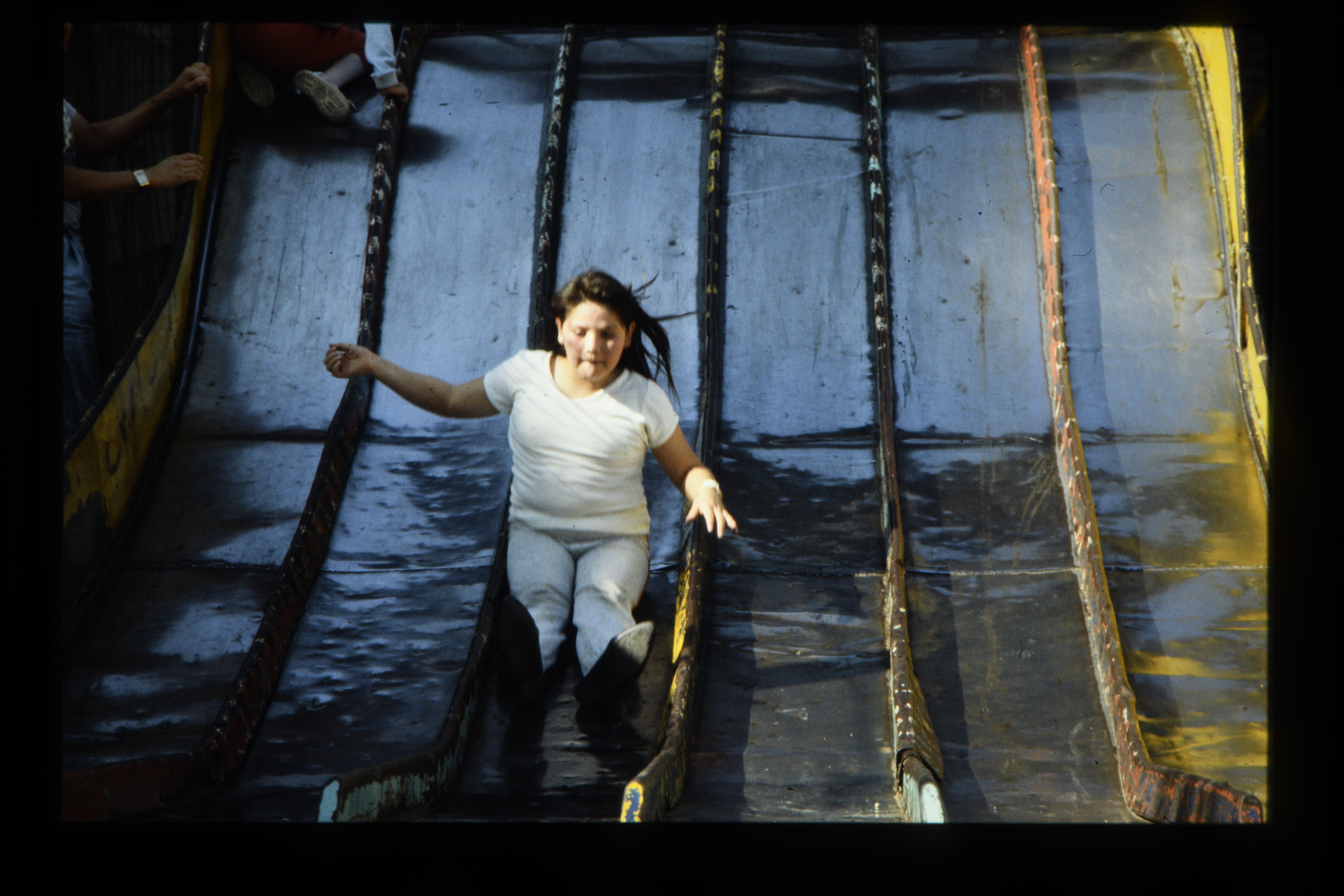 'Meisje glijdt van een glijbaan naar benlen. Mexico-...
