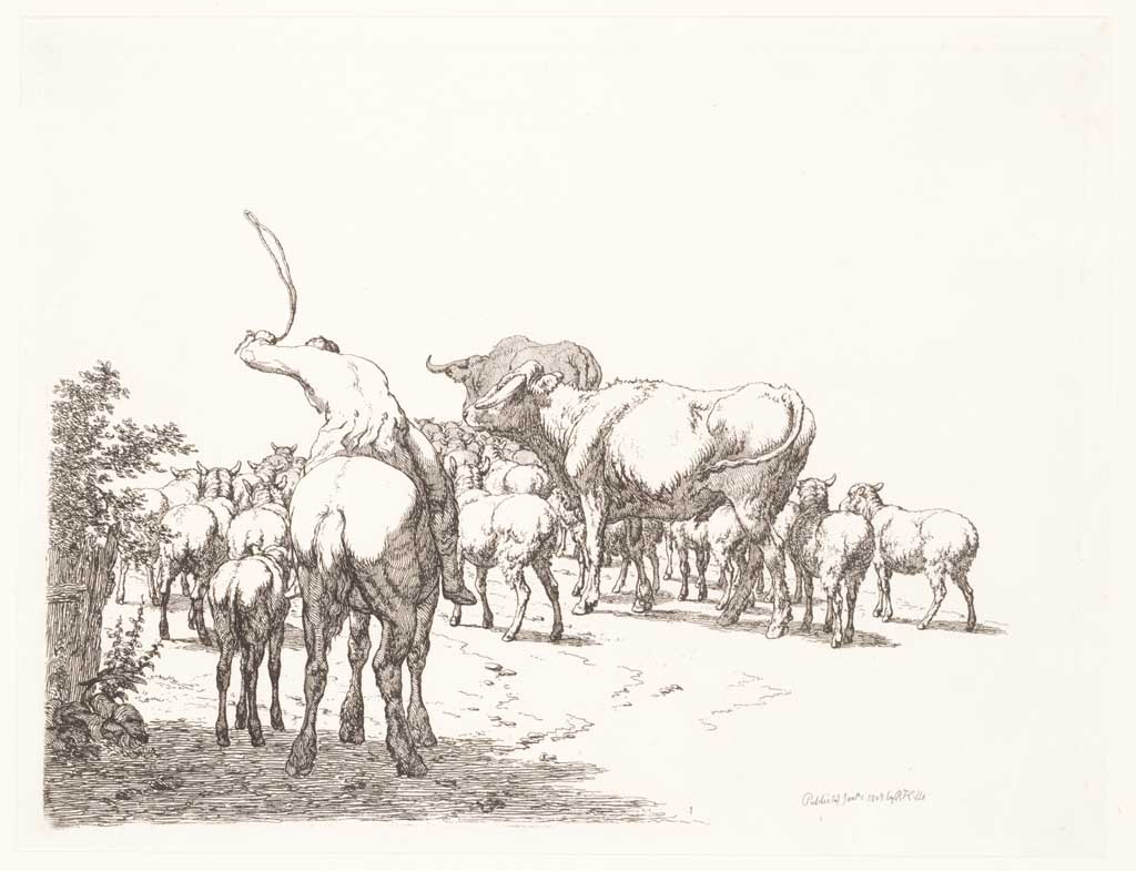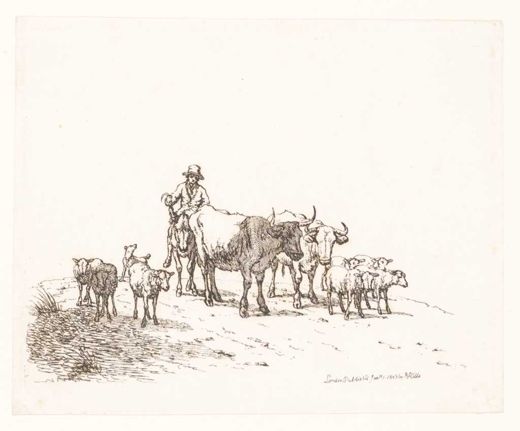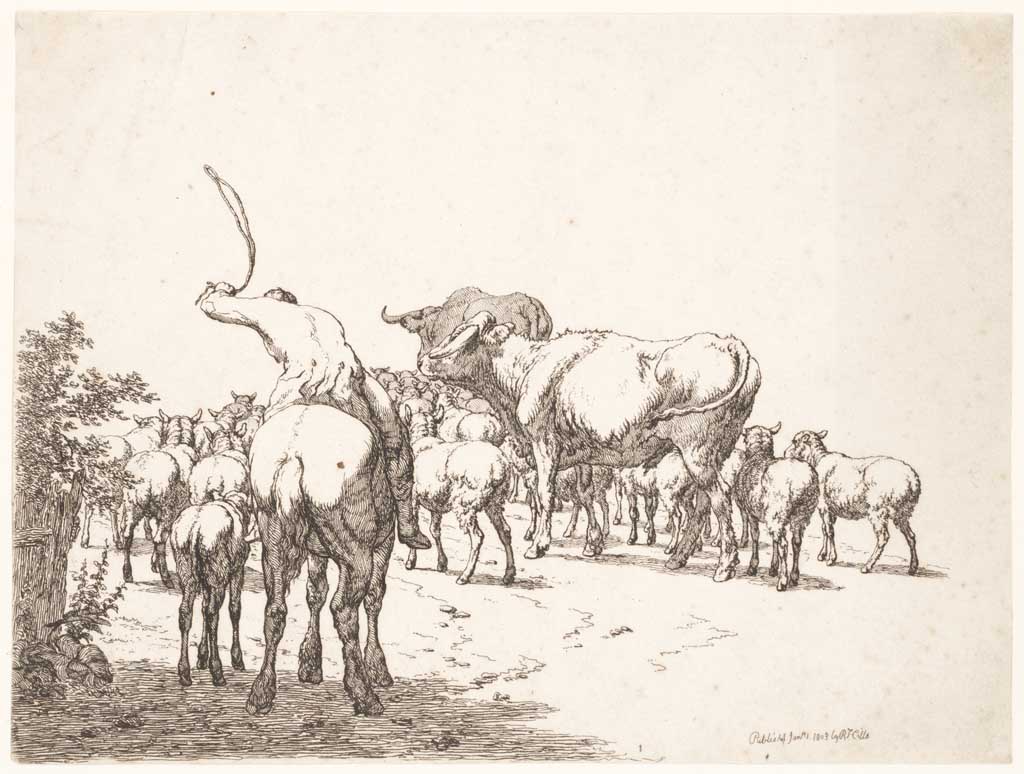 Herder drijft kudde schapen en koeien