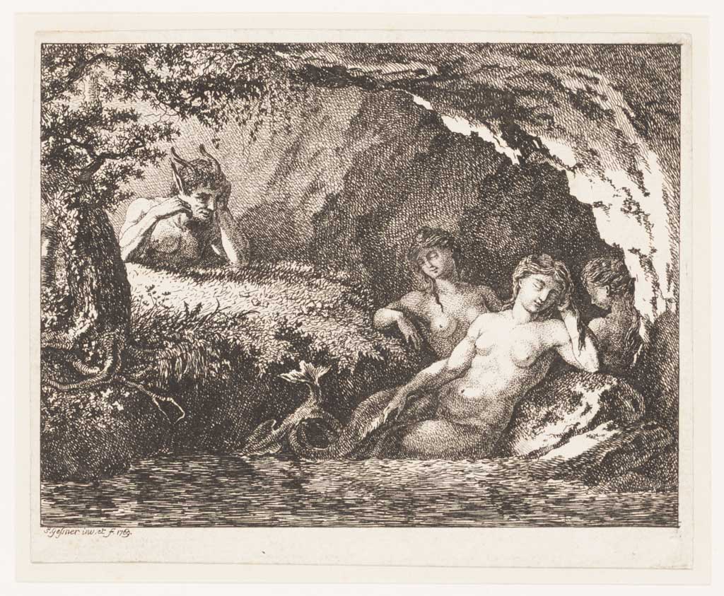 Drie slapende waternimfen bespied door een sater