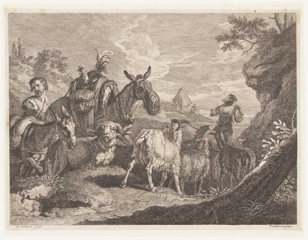 Herder met kudde geiten passeert man met twee ezels