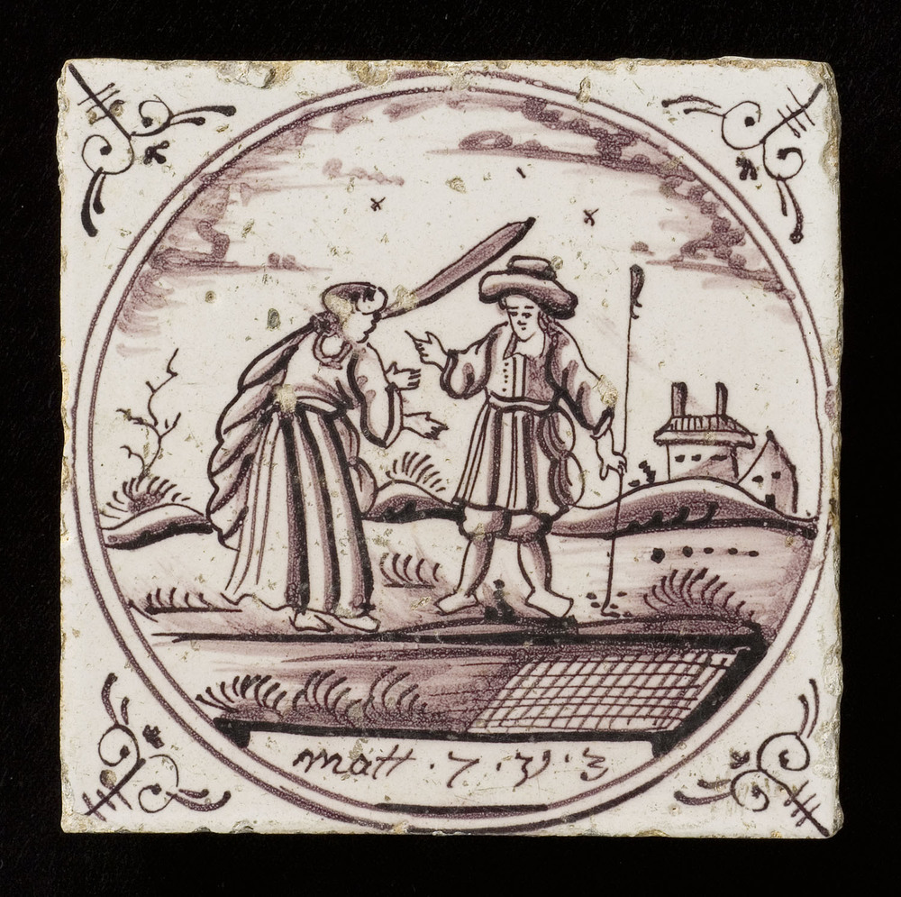 Tegel van keramiek met tinglazuur, voorstellende: De...