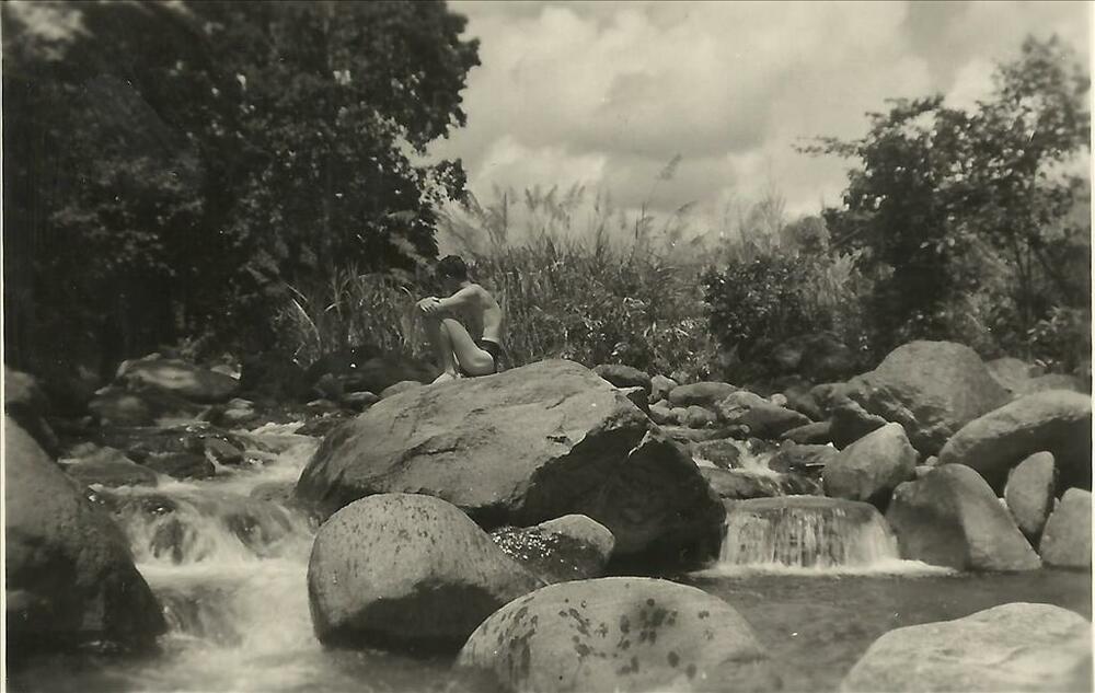 Nieuw-Guinea; stroomversnelling, blanke man in zwemb...