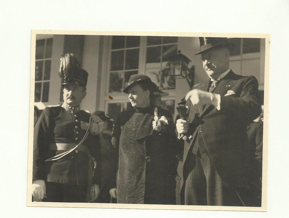 Foto van mevr Mussert met een officier in parade uni...