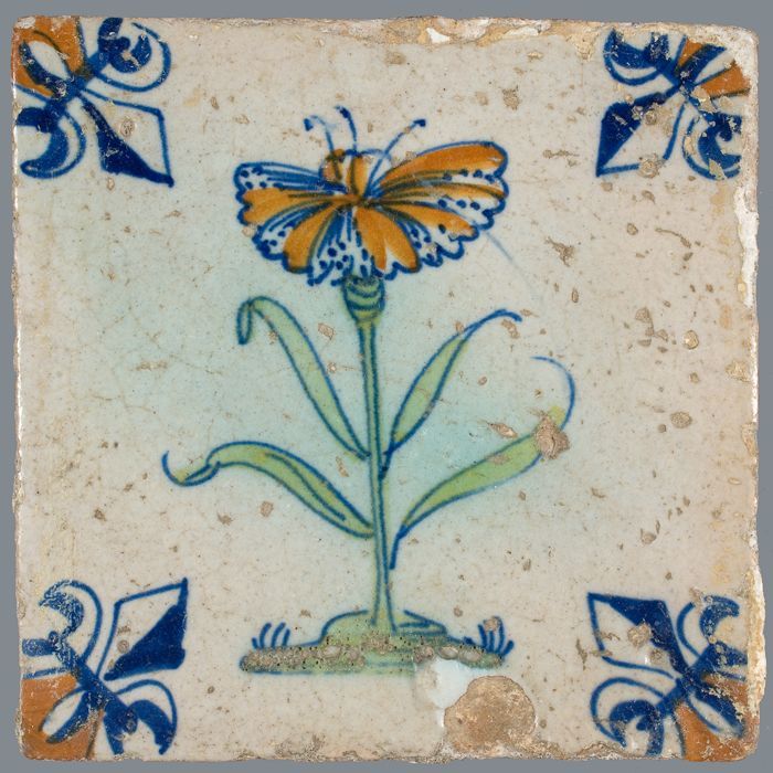 Bloemtegel, bloem op grondje, hoekmotief lelie, hoek...