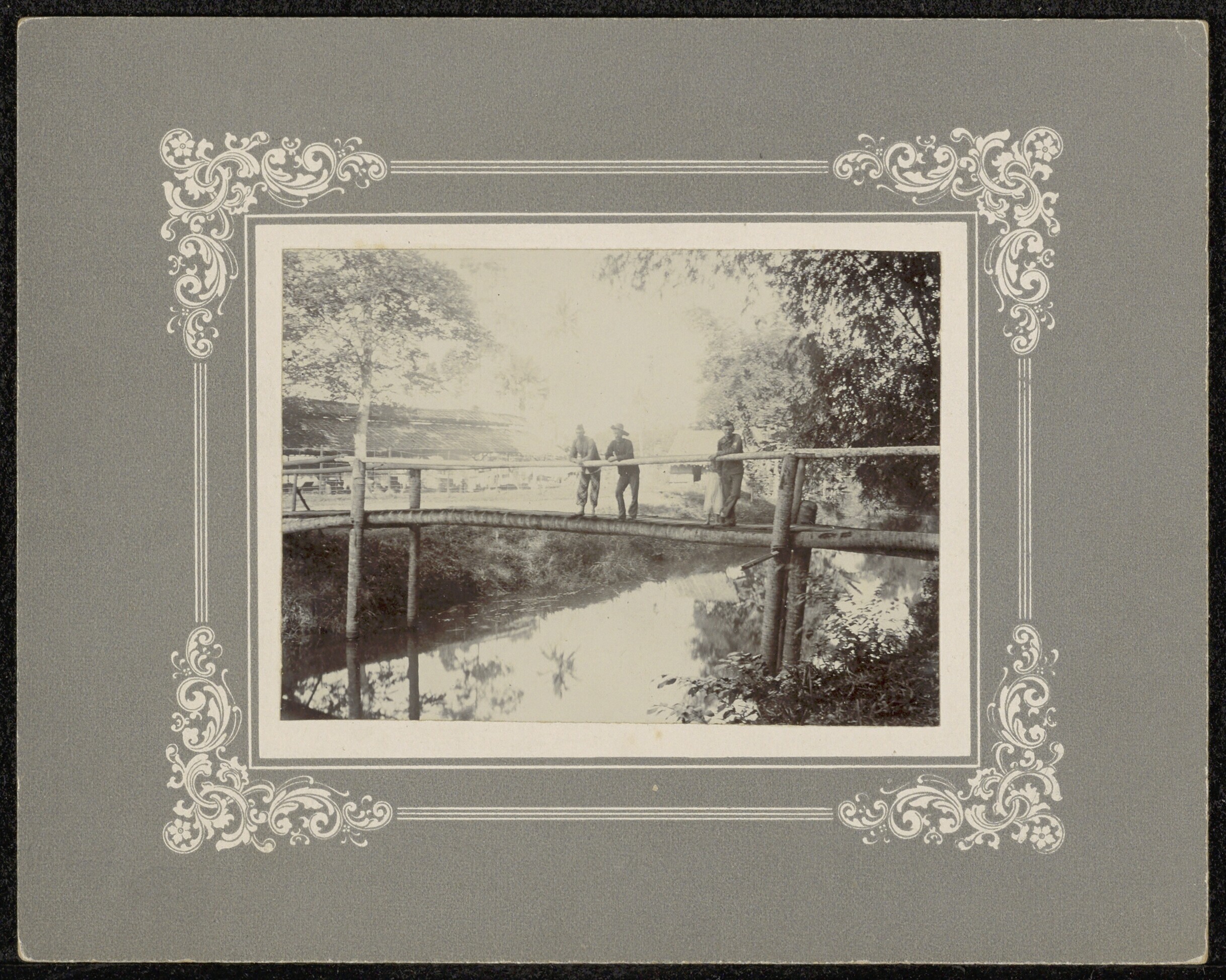 Mensen op een brug van palmboomstammen te Lueng Putu