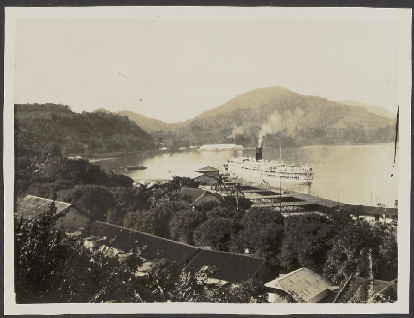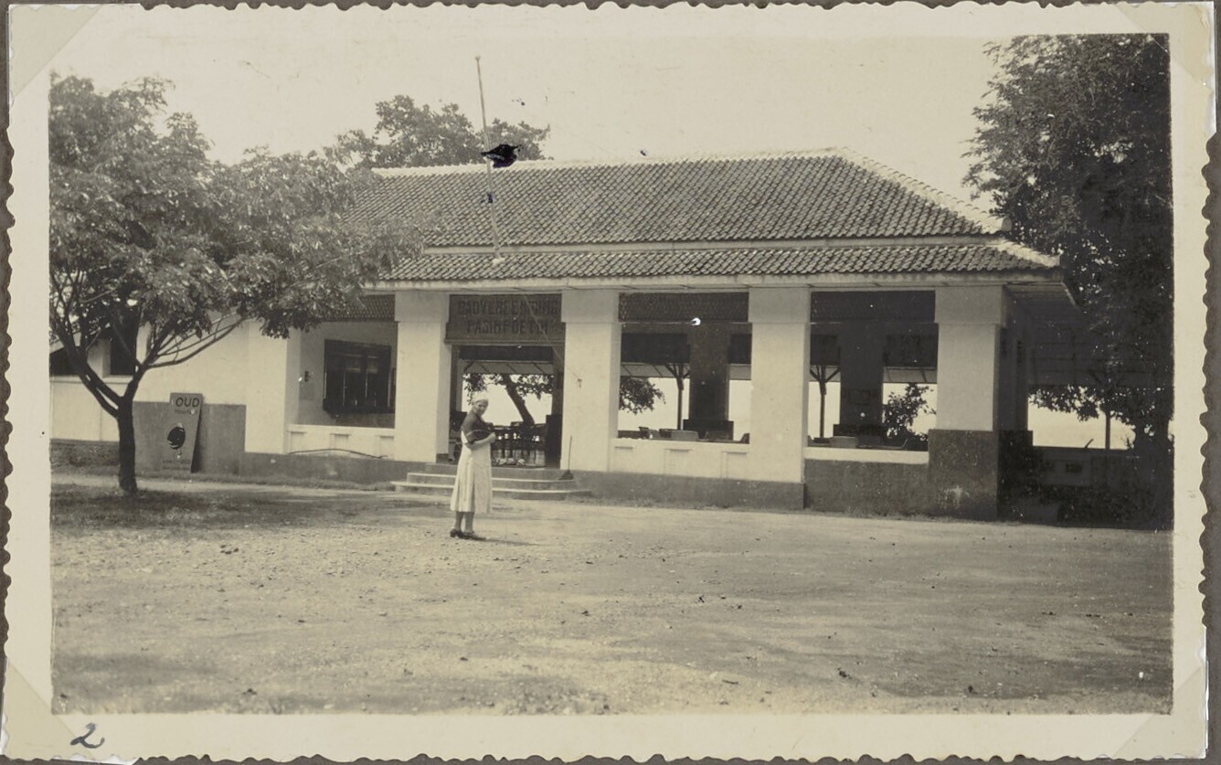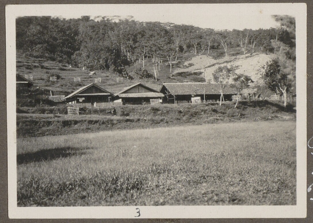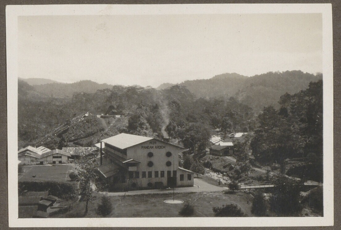 Uitzicht op de winkels en theefabriek van Pandanarum