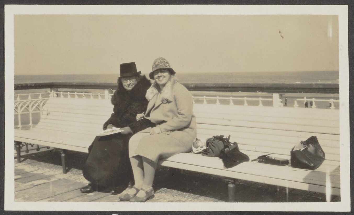 Twee Europese vrouwen zitten op een bank bij de kust...