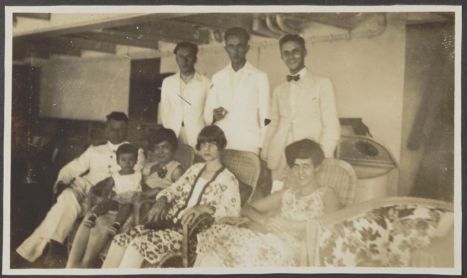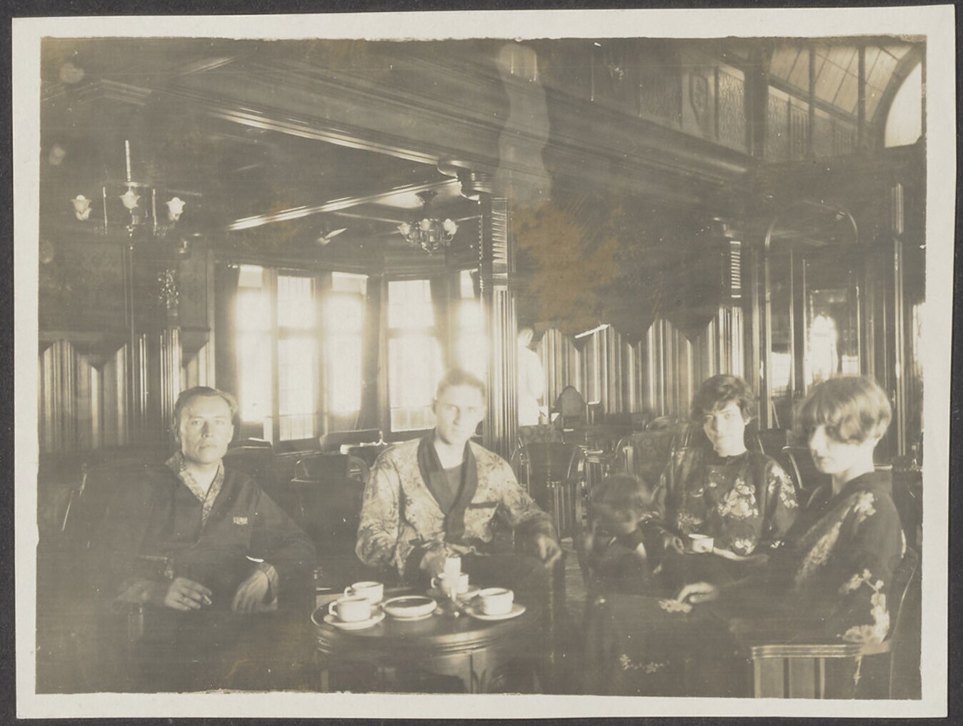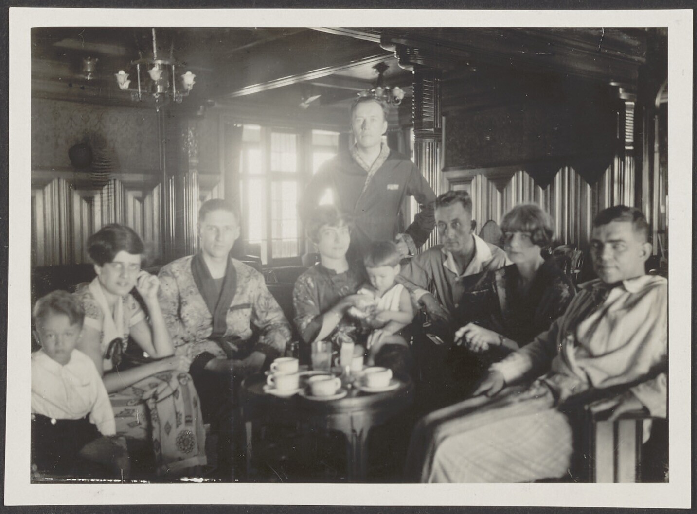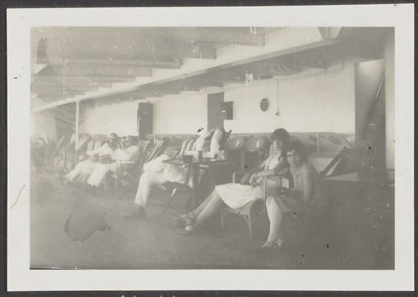 De passagiers, waaronder Netty en Lien, zitten op lu...