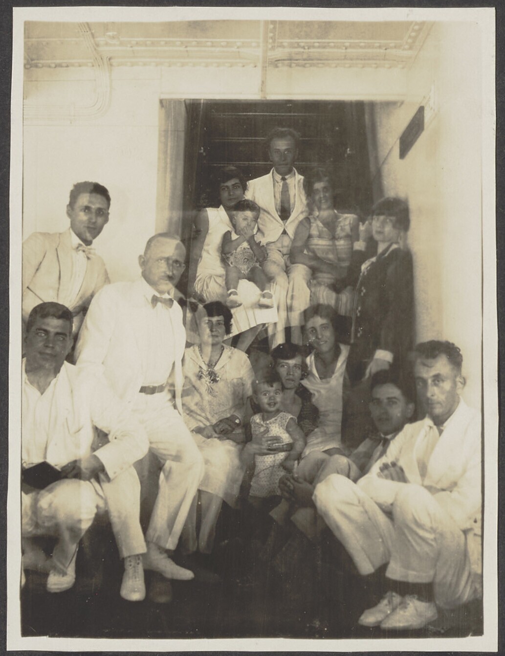 Europese mannen, vrouwen en kinderen poseren met z'n...