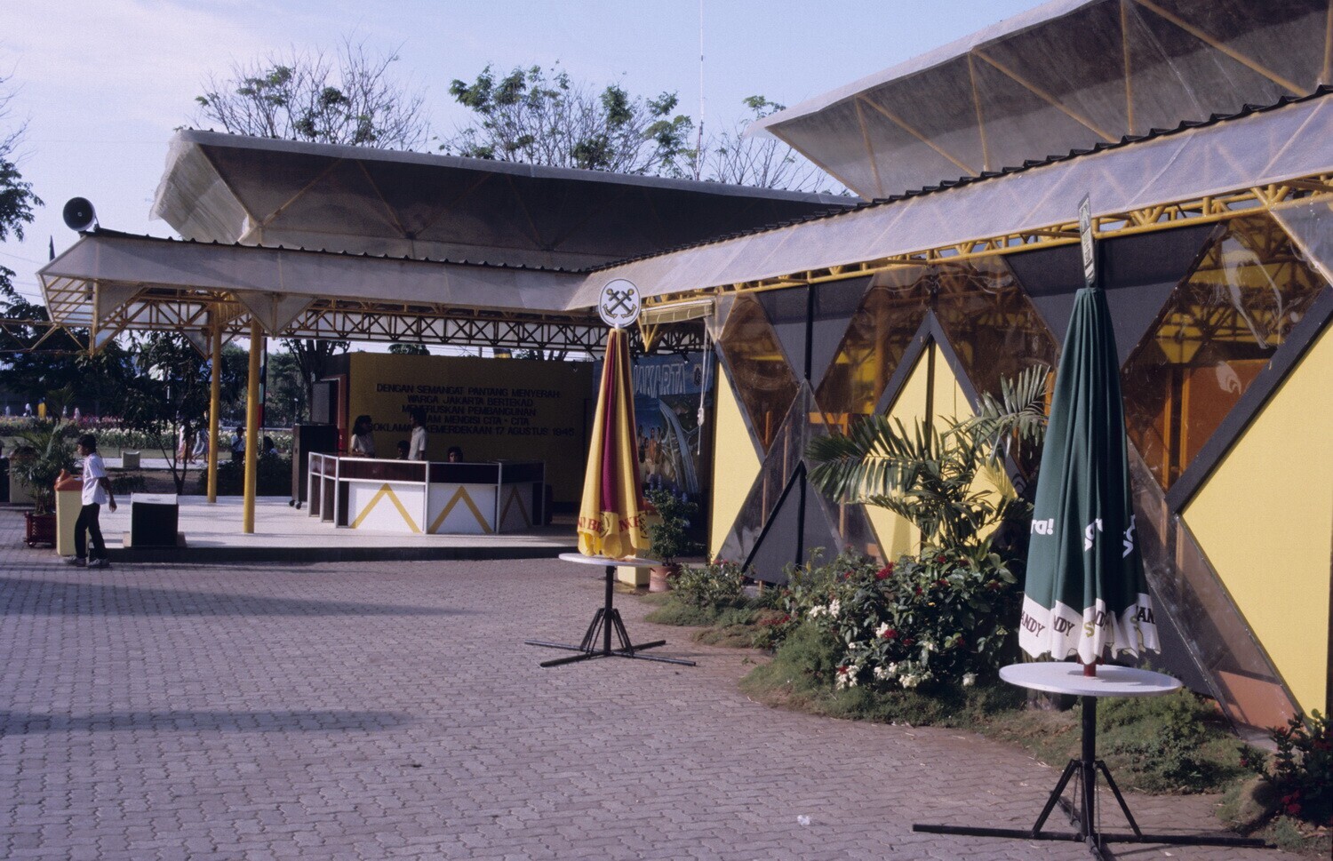 Bushalte aan de Jalan Mèrdeka Barat met resp. een ge...