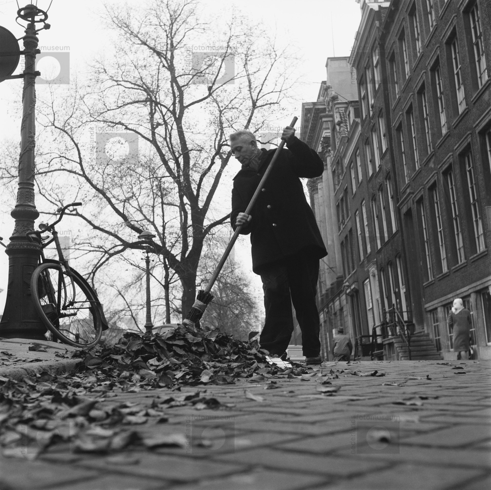 Amsterdam. Straatveger veegt de afgevallen boomblade...