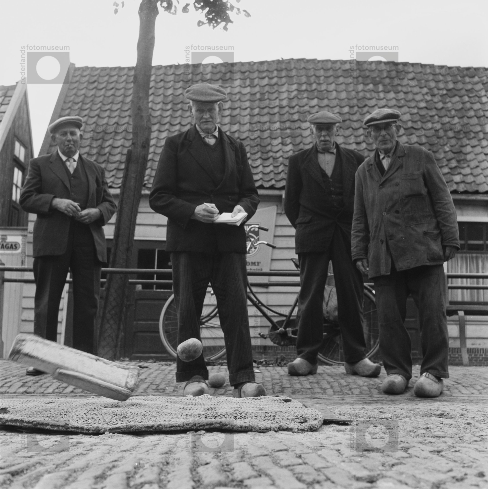 Beemster. Mannen spelen op straat met elkaar een spe...