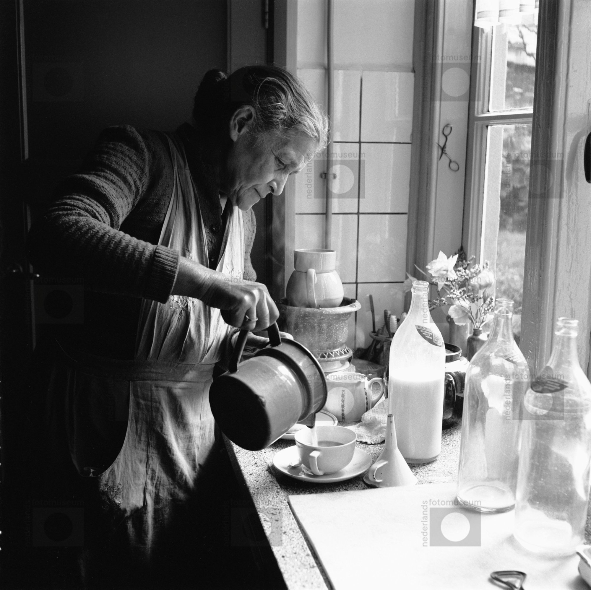 Amsterdam. Oude vrouw. Koffie zetten op petroleumstel