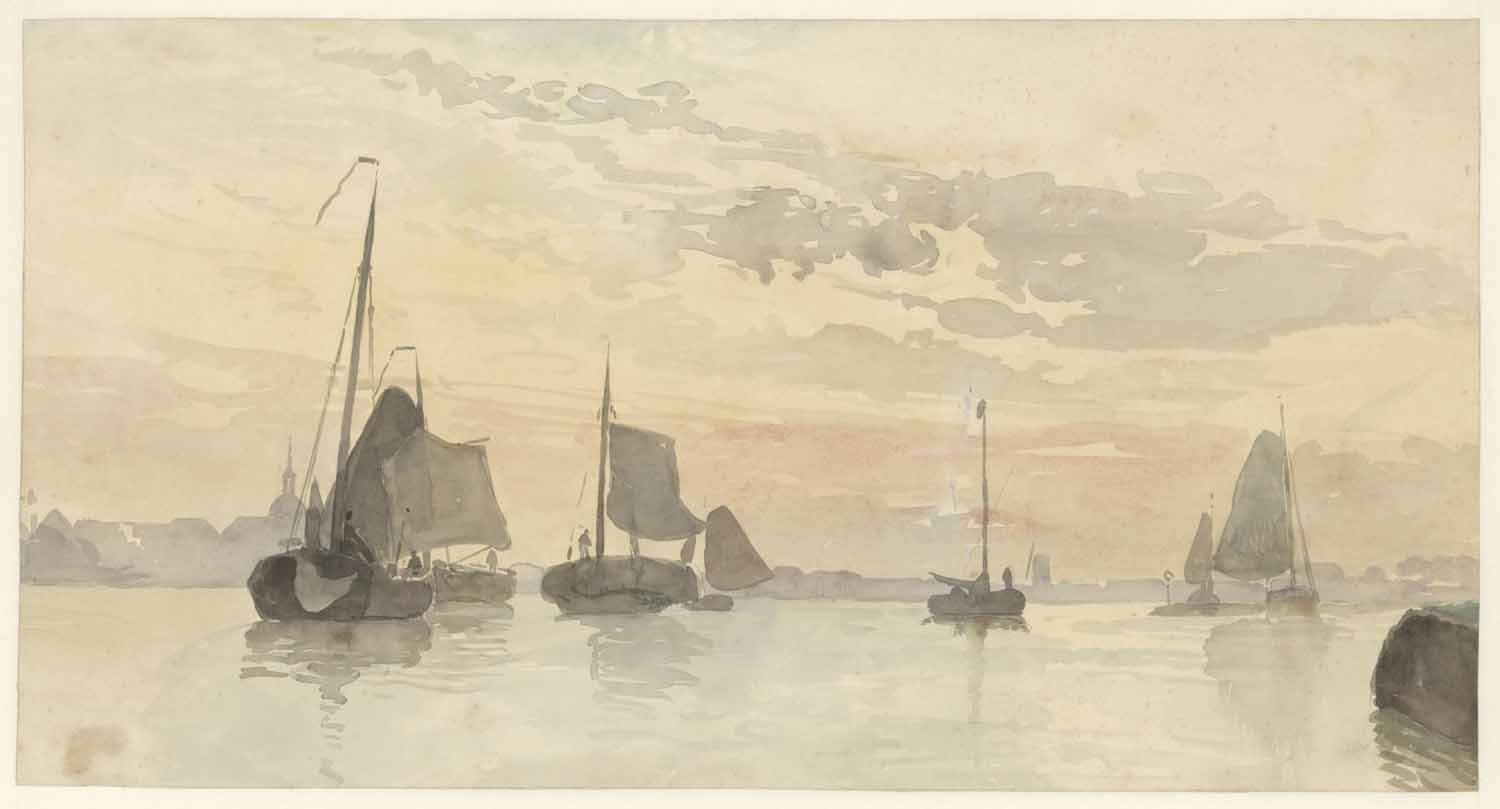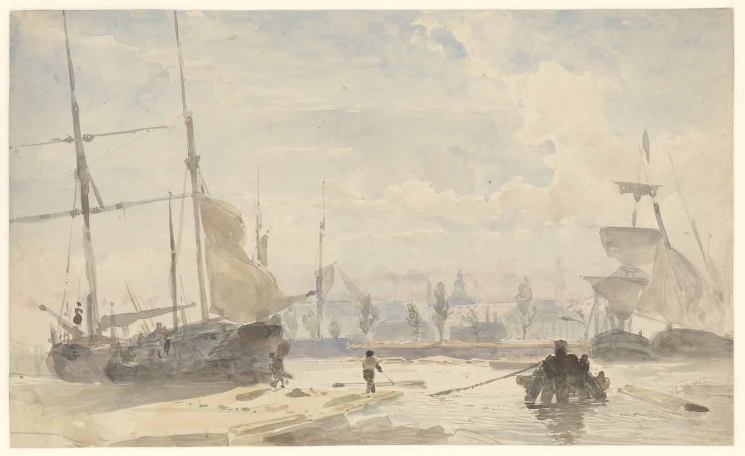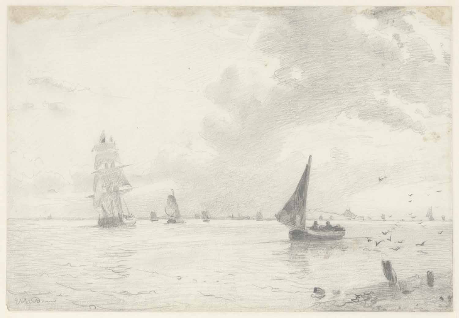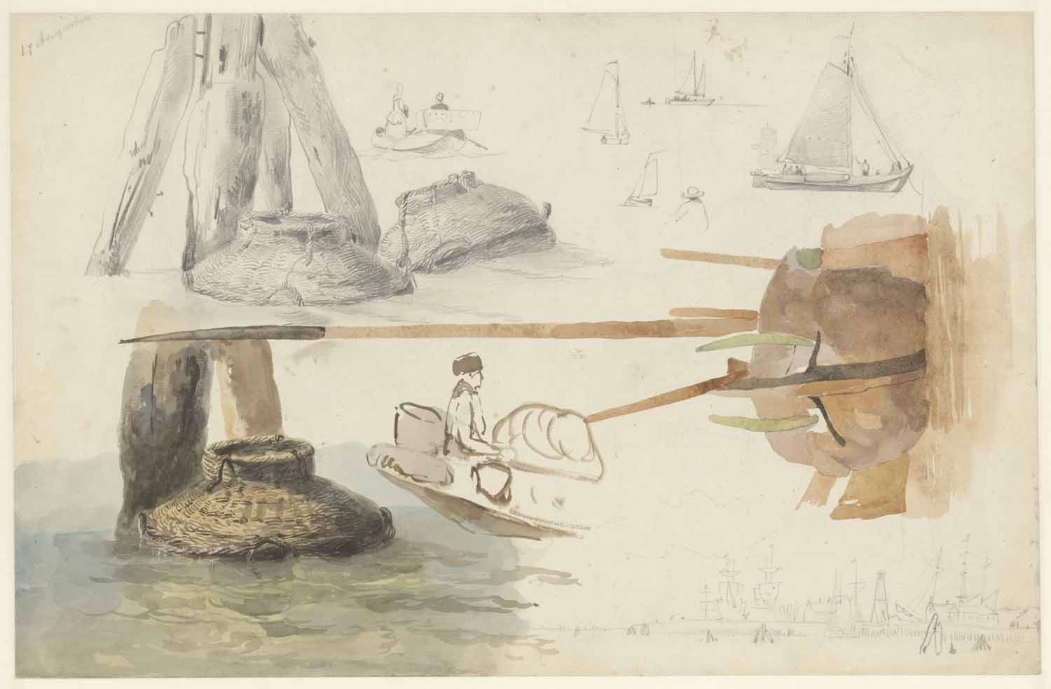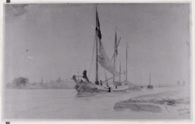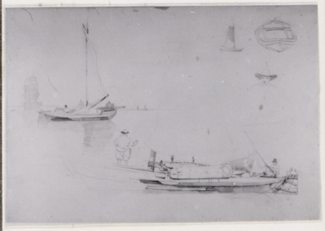Studieblad met riviergezicht (Schiedam) boot met fig...