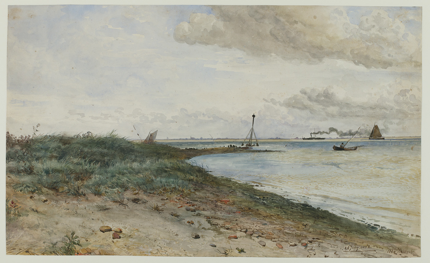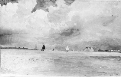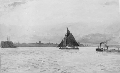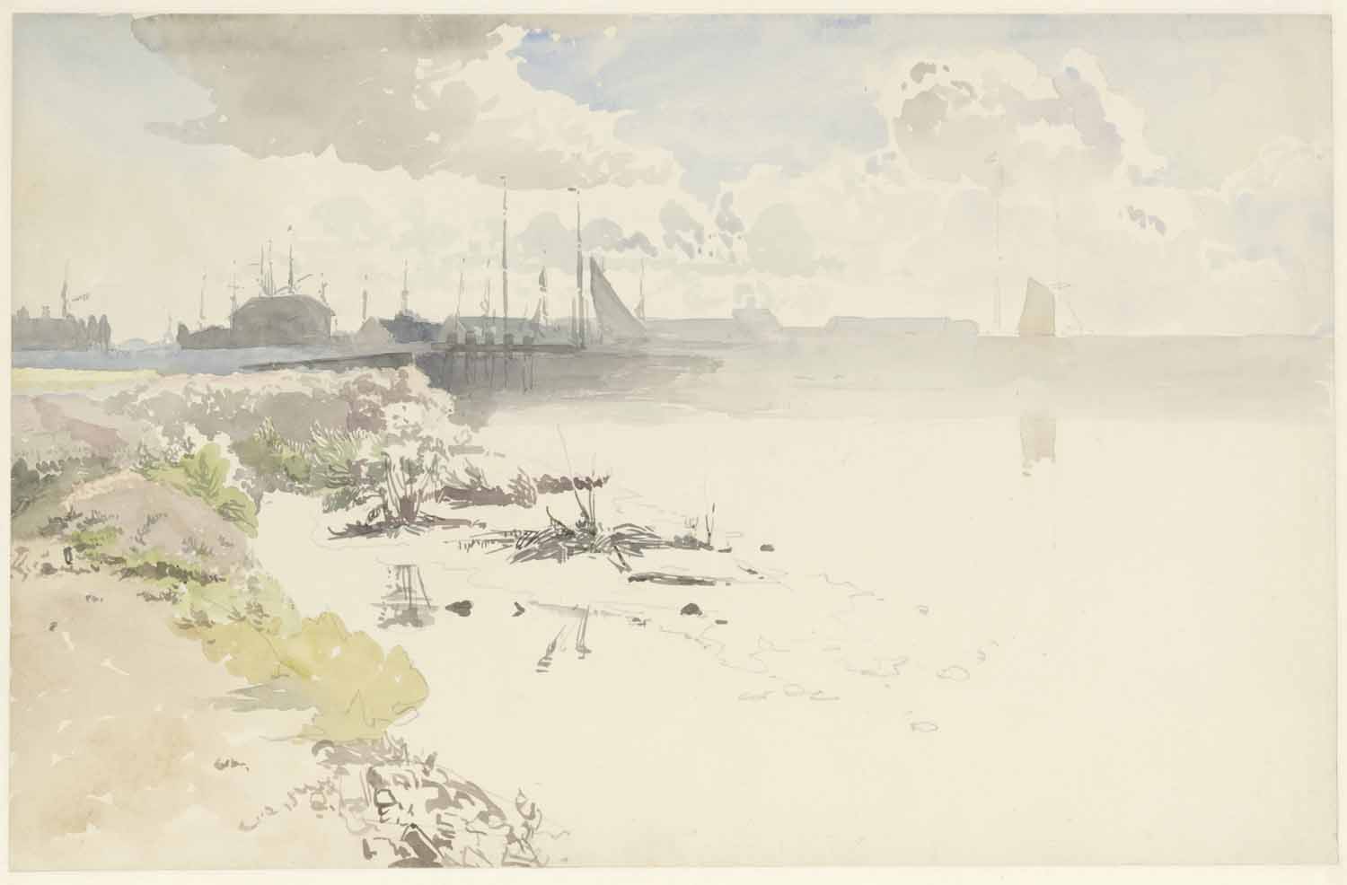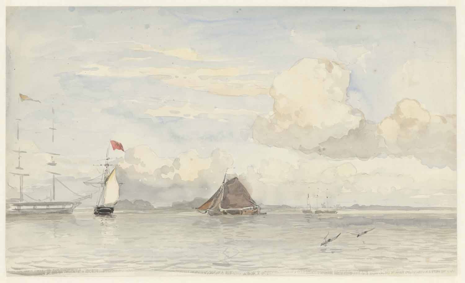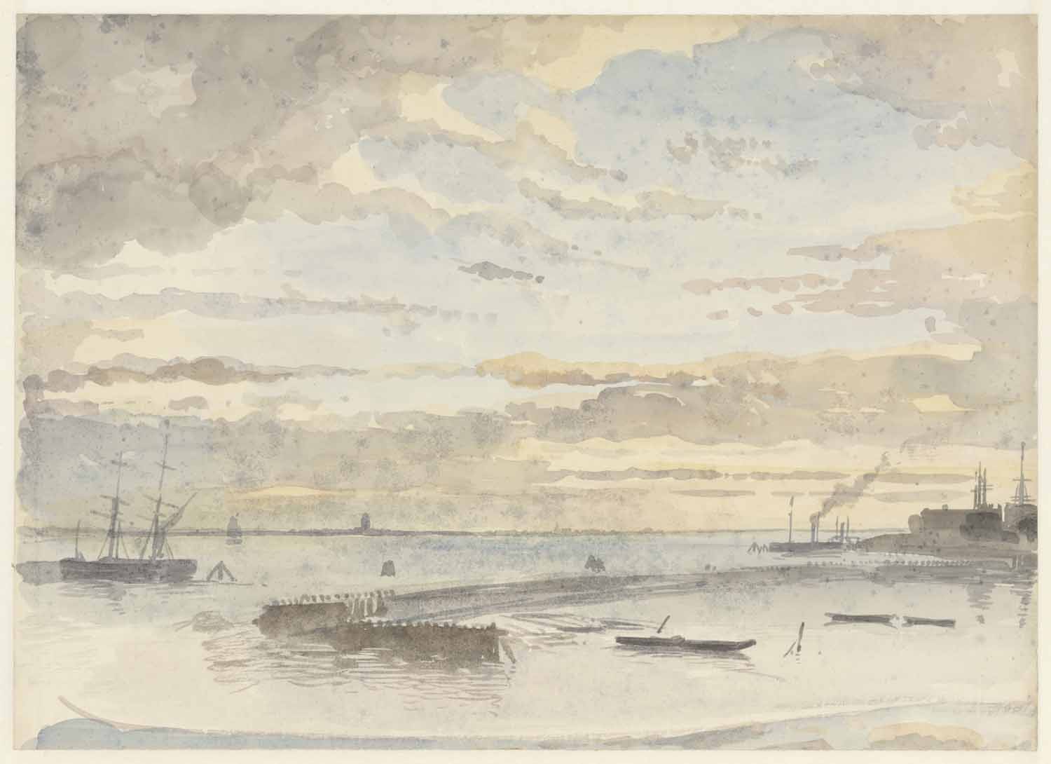 Studieblad met riviergezicht (Schiedam) boot met fig...