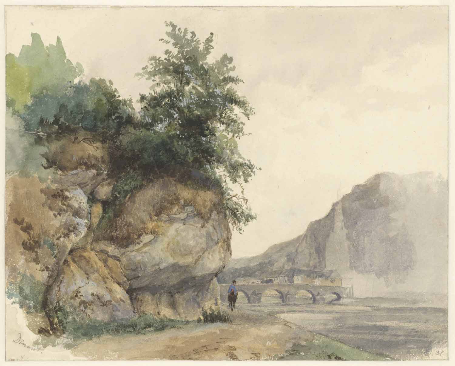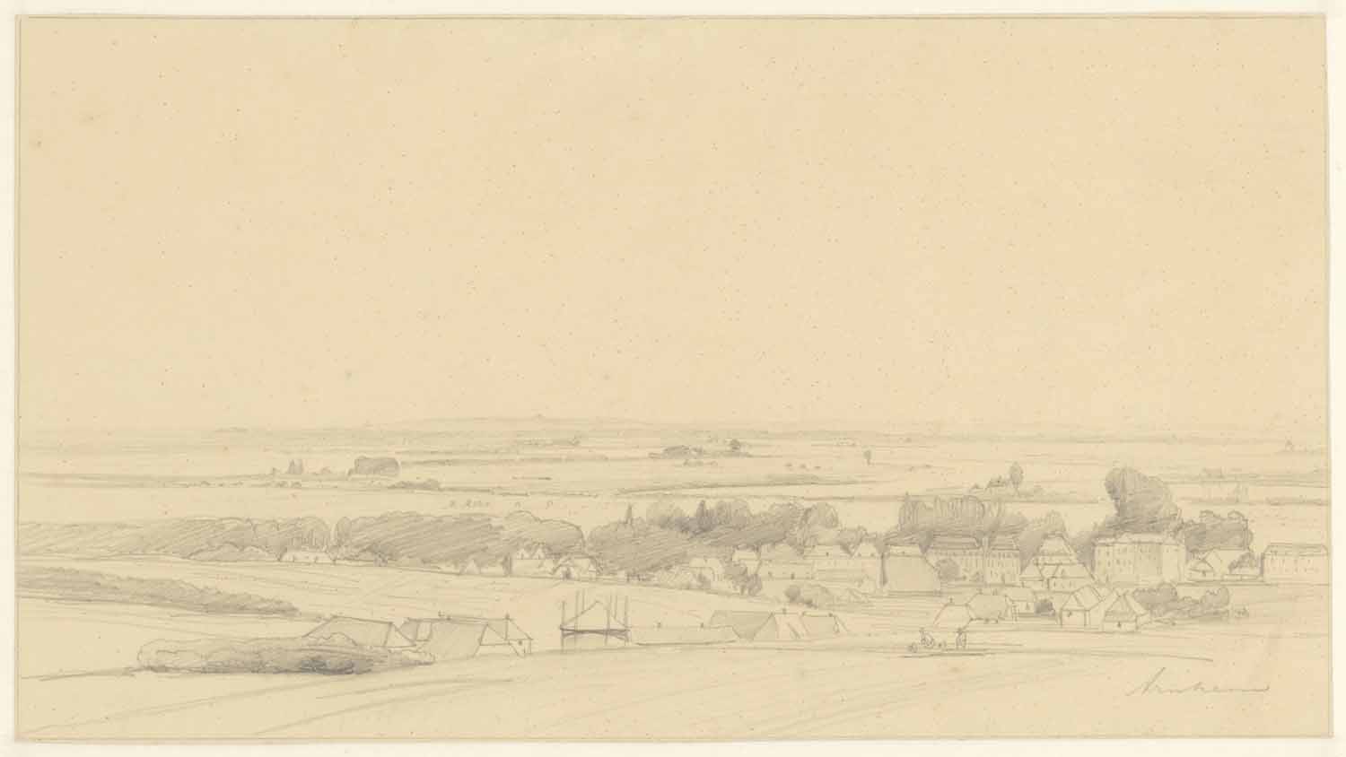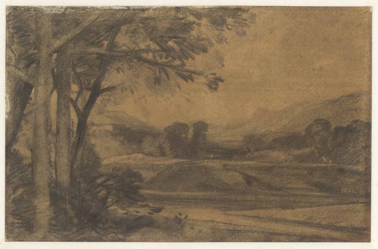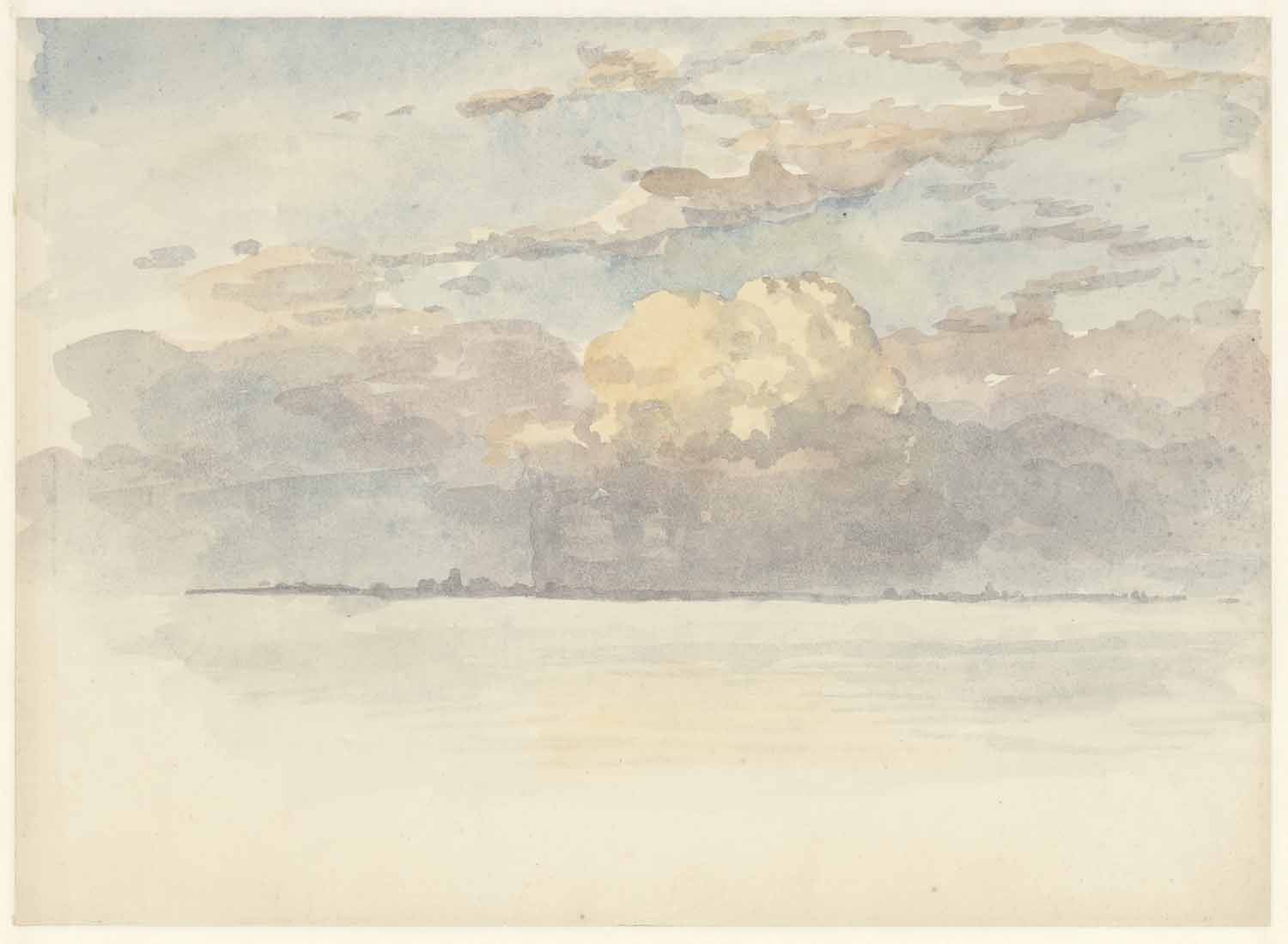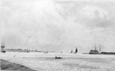 Studieblad met riviergezicht (Schiedam) boot met fig...