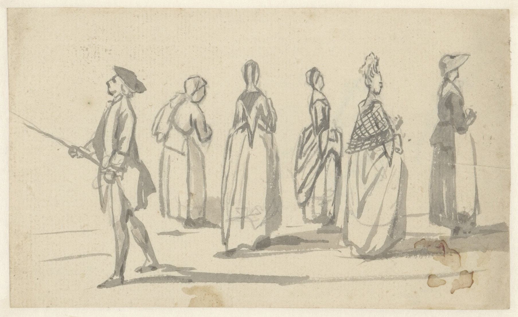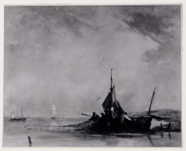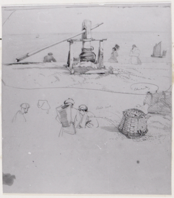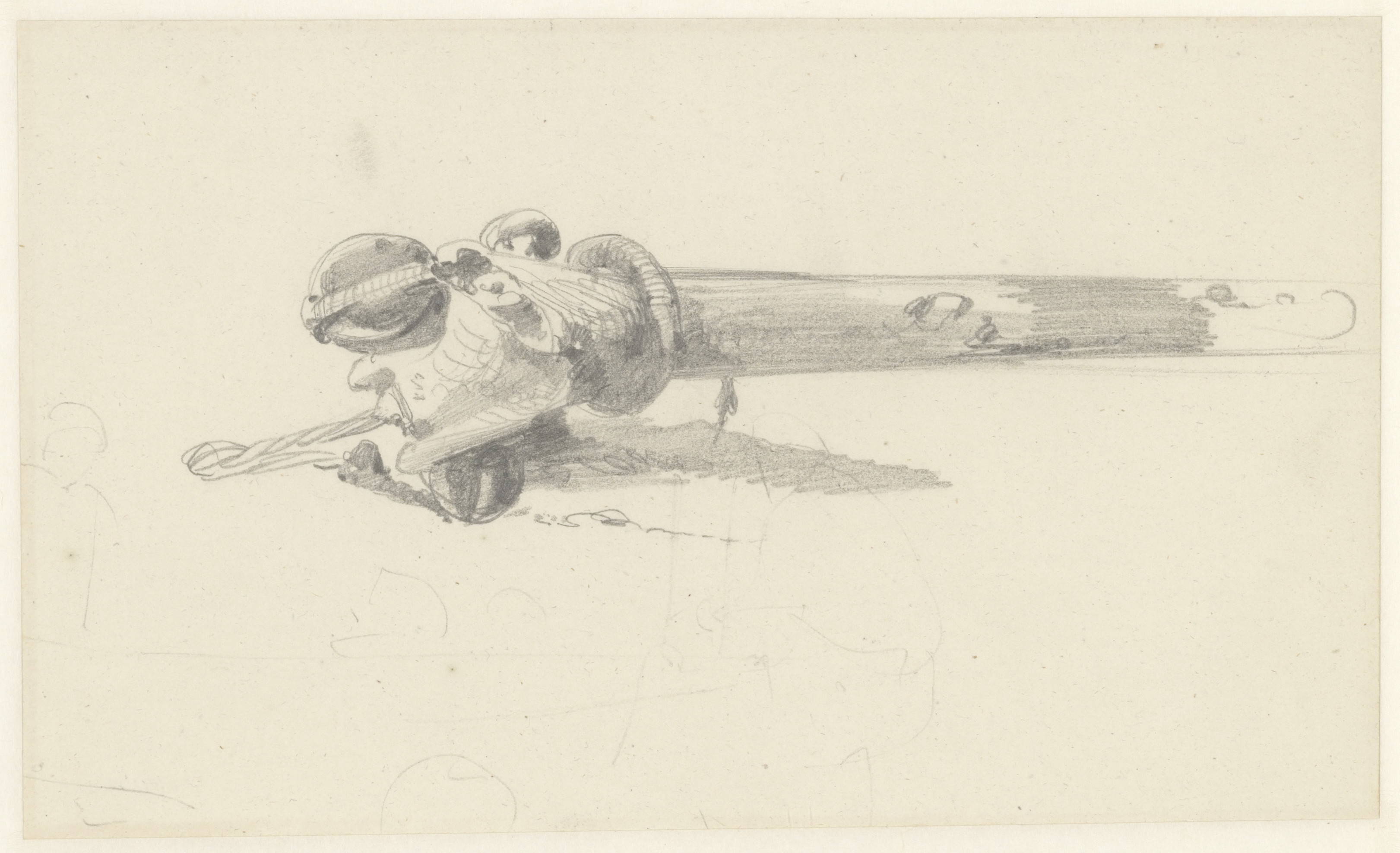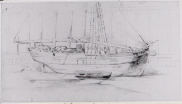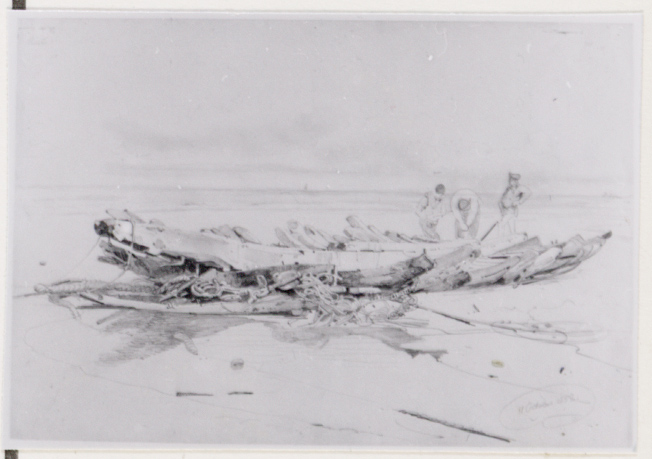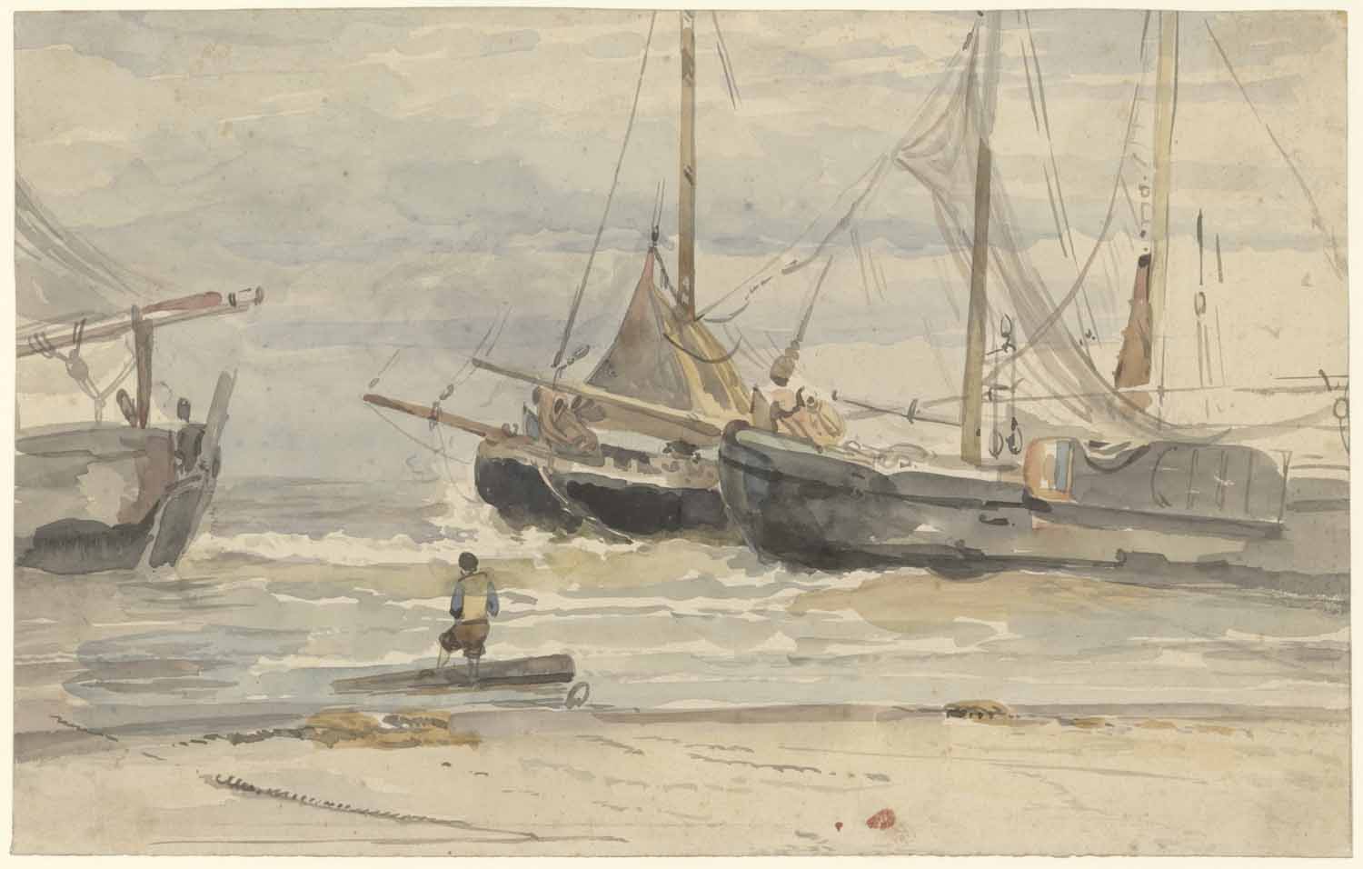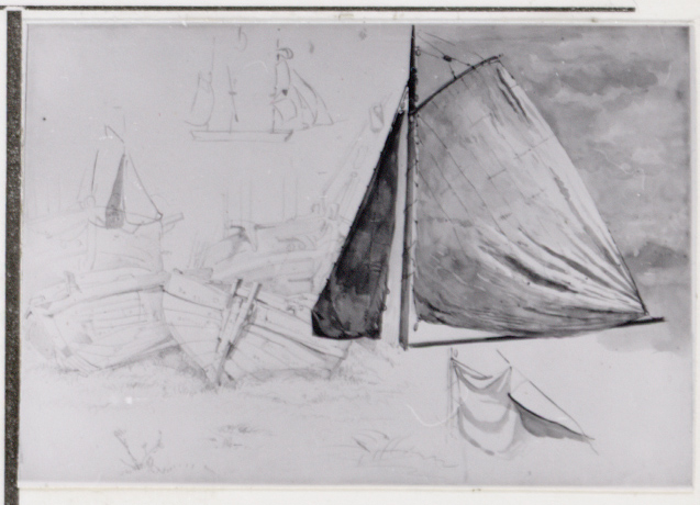 Roei- en zeilboten aan land, ernaast een studie van ...