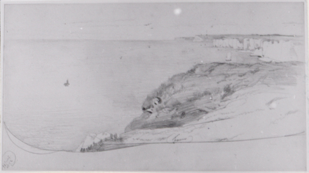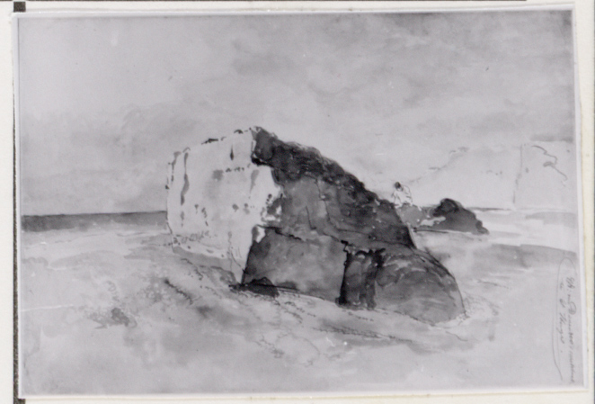 Rotsblok in zee voor een rotskust (recto), gestrand ...