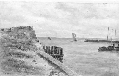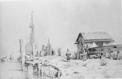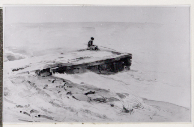 Vissersjongen op een aanlegsteiger. Verso: idem.