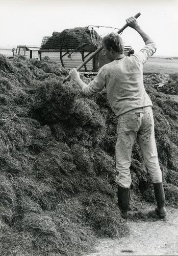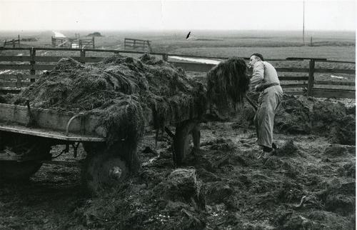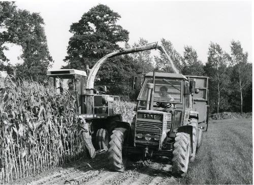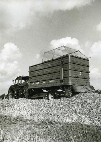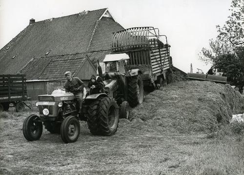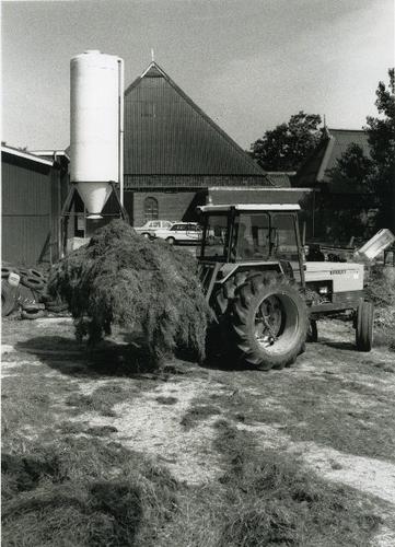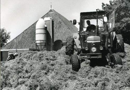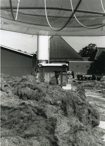 Foto in zwart-wit van het laden van kuilgras op een ...